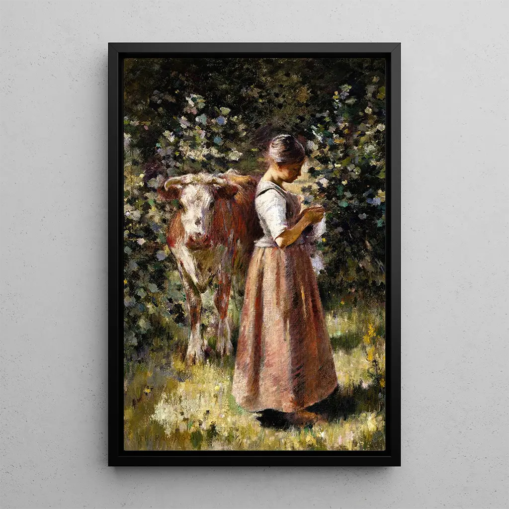 Dans "La vachère", Theodore Robinson capture l'essence d'une scène bucolique empreinte de sérénité. La composition met en avant une jeune femme, vêtue d'une robe simple, qui s'occupe d'une vache dans un paysage verdoyant. Les couleurs douces et naturelles, allant des verts éclatants aux bruns chauds, créent une atmosphère apaisante. La technique impressionniste de Robinson, caractérisée par des coups de pinceau fluides et une lumière subtile, donne vie à cette scène quotidienne, invitant le spectateur à ressentir la tranquillité de la campagne. Cette toile évoque non seulement la beauté de la nature, mais aussi la simplicité et l'harmonie de la vie rurale.