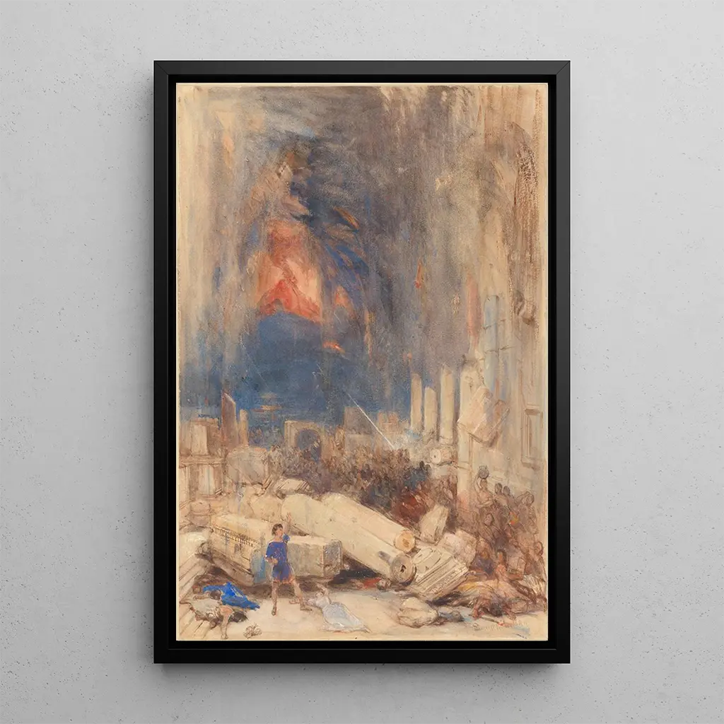 De Destruction de Pompéi, een iconisch kunstdruk van David Roberts, dompelt ons onder in een indrukwekkend tableau waar tragedie en schoonheid samenkomen. De warme kleuren en diepe schaduwen roepen de hitte van de Vesuvius vulkaan op, terwijl de minutieuze details van de ruïnes de verloren grootheid van deze oude stad herinneren. De aquareltechniek, vakkundig toegepast, brengt deze apocalyptische scène tot leven, waar de beweging van de aswolken bijna voelbaar lijkt. De sfeer is zowel melancholisch als fascinerend, en nodigt de kijker uit om na te denken over de kwetsbaarheid van de beschaving.