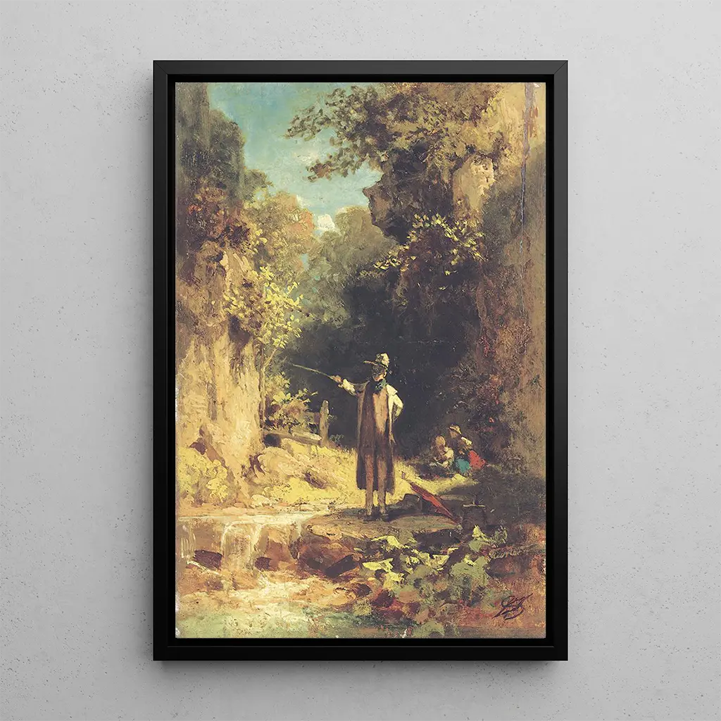 Dans cette œuvre emblématique, Carl Spitzweg capture la tranquillité d'un pêcheur absorbé par la nature. Le tableau dépeint un homme, canne à pêche à la main, perdu dans ses pensées au bord d'une rivière paisible. Les couleurs douces et les nuances de vert et de bleu évoquent une atmosphère sereine, tandis que la lumière naturelle illumine délicatement la scène. La technique de Spitzweg, qui mêle réalisme et romantisme, crée une harmonie visuelle qui invite à la contemplation. Chaque détail, des reflets dans l'eau aux feuillages environnants, contribue à l'impression de calme et de connexion avec la nature.