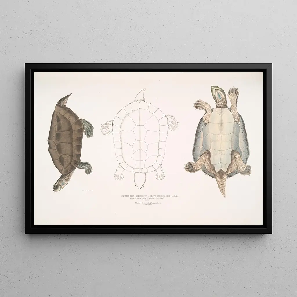 Dhongoka Terrapin Emys Dhongoka : een wonder van de natuur onthuld De kunstdruk van Dhongoka Terrapin Emys Dhongoka, een werk van John Edward Gray, dompelt ons onder in een wereld waar de waterfauna met opmerkelijke precisie wordt belicht. De levendige kleuren en de minutieuze details van dit doek roepen de wilde schoonheid van de natuur op. De aquareltechniek, gebruikt door Gray, stelt ons in staat de delicatesse van de schubben en de vloeiendheid van het water vast te leggen, waardoor een rustgevende en contemplatieve sfeer ontstaat. Elke penseelstreek lijkt een verhaal te vertellen, dat van een onderwaterwereld vol biodiversiteit, en nodigt de kijker uit om zich te verwonderen over de complexiteit van het leven. John Edward Gray : een pionier in de illustratie van de zoologie John Edward Gray, een Britse naturalist en zoöloog uit de 19e eeuw, speelde een cruciale rol in de wetenschappelijke illustratie van de fauna. Zijn werk werd beïnvloed door de ontdekkingen van zijn tijd, waarin de ontdekking van nieuwe soorten op zijn hoogtepunt was. Gray heeft bijgedragen aan de classificatie van reptielen en amfibieën, en zijn werken, zoals de kunstdruk van Dhongoka Terrapin Emys Dhongoka, getuigen van zijn inzet voor wetenschap en kunst. Als conservator van het British Museum heeft hij ook gewerkt aan de bescherming van specimens, waardoor hij een iconische figuur is in de natuurlijke geschiedenis. Een decoratief stuk met vele voordelen Deze kunstdruk van Dhongoka Terrapin Emys Dhongoka is een decoratief stuk dat elke ruimte kan verrijken, of het nu een woonkamer, kantoor of slaapkamer is. De kwaliteit van de afdruk en de trouw aan de details van het origineel maken van dit doek een ideale keuze voor liefhebbers van natuur en kunst. De esthetische aantrekkingskracht van dit werk ligt in zijn vermogen om een vleugje sereniteit en harmonie aan uw interieur toe te voegen, terwijl het gesprekken over biodiversiteit en de schoonheid van de natuurlijke wereld stimuleert.