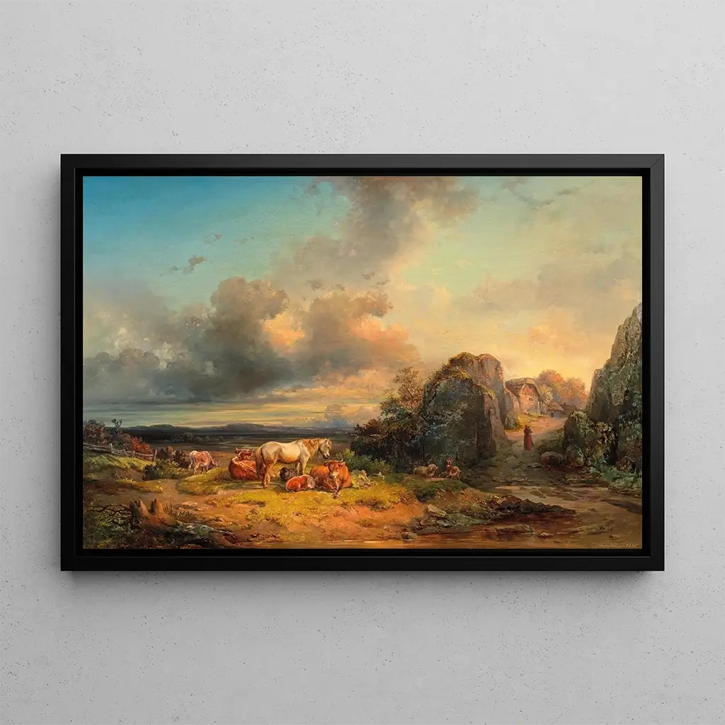 Animaux dans le paysage : une harmonie entre faune et flore L'œuvre "Animaux dans le paysage" d'Edmund Mahlknecht évoque une scène bucolique où la nature s'épanouit en toute tranquillité. Les couleurs douces et les nuances de vert se mêlent à des touches de brun et de bleu, créant une atmosphère sereine et apaisante. La technique de Mahlknecht, caractérisée par des coups de pinceau délicats, donne vie aux animaux qui peuplent ce tableau. Chaque créature, qu'il s'agisse d'un cerf majestueux ou d'un oiseau en vol, semble s'intégrer harmonieusement dans ce paysage idyllique, invitant le spectateur à une contemplation silencieuse. Edmund Mahlknecht : un maître du paysage naturaliste Edmund Mahlknecht, artiste du XIXe siècle, est reconnu pour ses représentations de la nature, marquées par un style naturaliste. Influencé par les grands maîtres de son époque, il a su capturer la beauté des paysages et la vie sauvage avec une précision remarquable. Son œuvre s'inscrit dans une période où l'art se tourne vers la nature, cherchant à représenter la réalité avec une sensibilité accrue. Mahlknecht, à travers ses créations, nous rappelle l'importance de la préservation de notre environnement et la beauté qui en émane, faisant de lui une figure essentielle de l'art paysager. Une acquisition décorative aux multiples atouts La reproduction "Animaux dans le paysage" est une pièce décorative idéale pour embellir votre salon, bureau ou chambre. Sa qualité d'impression et sa fidélité aux couleurs originales en font un choix attrayant pour les amateurs d'art et de nature. En intégrant ce tableau dans votre intérieur, vous apportez une touche de sérénité et d'harmonie, tout en célébrant la beauté de la faune et de la flore. Ce tableau saura séduire vos invités et enrichir votre décoration, faisant de chaque regard un moment de contemplation.