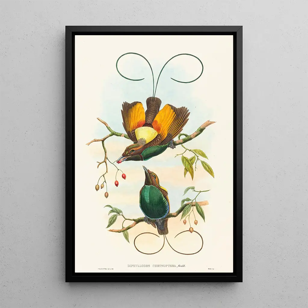 John Gould, Britse naturalist en ornitholoog uit de 19e eeuw, markeerde zijn tijd met zijn onvergelijkbare illustraties. Geïnspireerd door de wetenschappelijke ontdekkingen van zijn tijd, wijdde hij zijn leven aan de weergave van vogels en insecten, en droeg zo bij aan de kennis van de biodiversiteit. Zijn werken, waaronder de kunstdruk Diphyllodes chrysoptera, getuigen van een realistische en gedetailleerde stijl, kenmerkend voor de naturalistische beweging. Gould werkte ook samen met wetenschappers en ontdekkingsreizigers, wat hem toegang gaf tot zeldzame specimens en deze vastlegde in zijn kunst, waardoor hij een blijvende erfenis achterlaat in het veld van wetenschappelijke illustratie.