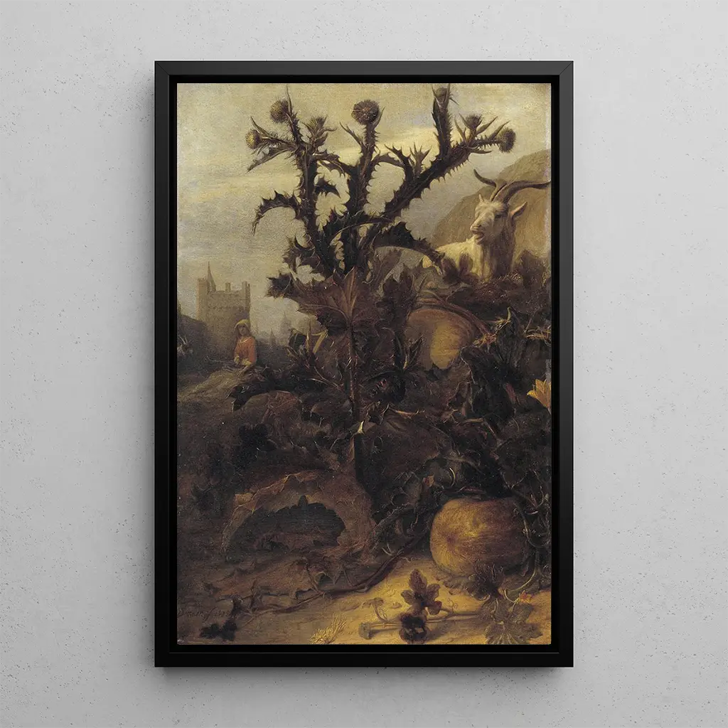 Chardon, pompoen en een geit : een idyllisch scène vol leven In deze kunstdruk van Chardon, pompoen en een geit vangt Lambert Doomer de essentie van een levendige en bruisende natuur. De compositie wordt gedomineerd door warme, aardse kleuren die de rijkdom van de herfstoogst oproepen. De minutieuze details van planten en dier creëren een sfeer van sereniteit en eenvoudige vreugde. Het zachte licht dat de scène badend, voegt een bijna magische dimensie toe en nodigt de kijker uit om zich onder te dompelen in dit landelijke schilderij. Elk element, van de distel tot de kromming van de geit, lijkt een verhaal te vertellen over harmonieuze co-existentie tussen mens en natuur. Lambert Doomer: een meester van het Vlaamse landschap Lambert Doomer, actief in de 17e eeuw, is een Vlaamse kunstschilder wiens werk zich onderscheidt door zijn vermogen om de natuur met opmerkelijke precisie en gevoeligheid weer te geven. Geïnspireerd door zijn tijdgenoten, wist hij realistische elementen te integreren terwijl hij een poëtische toets behield. Zijn stijl, geworteld in het barok, getuigt van een periode waarin landschapsschilderkunst een groeiende rol speelde in de Europese kunst. Doomer was ook een pionier in het afbeelden van scènes uit het dagelijks leven, wat hem onderscheidde in de artistieke wereld van zijn tijd. Een decoratief kunstwerk met vele voordelen De reproductie van Chardon, pompoen en een geit is een ideaal decoratief stuk om de sfeer in uw woonkamer, kantoor of slaapkamer te verrijken. De afdrukkwaliteit garandeert een goede kleurgetrouwheid en details, zodat u optimaal van het originele werk kunt genieten. Met zijn esthetische aantrekkingskracht brengt dit schilderij een vleugje natuur en rust in uw interieur. Of het nu gaat om een rustieke of moderne inrichting, dit doek past harmonieus in diverse stijlen en is een slimme keuze voor wie een vleugje charme aan zijn ruimte wil toevoegen.