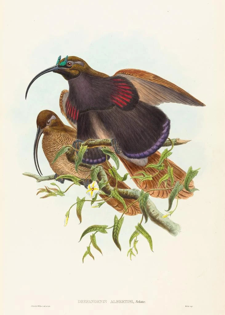 Drepanornis albertisi : een ode aan de biodiversiteit op eilanden De kunstdruk van Drepanornis albertisi, ook bekend als "de raaf van Nieuw-Guinea", is een fascinerend kunstwerk dat de rijkdom van de biodiversiteit viert. John Gould, met zijn uitzonderlijke talent, is erin geslaagd de majesteit van deze iconische vogel vast te leggen met levendige kleuren en een evenwichtige compositie. De nuances van zwart en blauw, gecombineerd met minutieuze details, creëren een sfeer die zowel mysterieus als boeiend is. Goulds graveertechniek benadrukt de unieke kenmerken van deze vogel, waardoor deze kunstdruk een echt ornithologisch meesterwerk is. John Gould : een visionair in de ornithologie John Gould, beroemde ornitholoog van de 19e eeuw, heeft een onuitwisbare indruk achtergelaten in de wereld van de naturalistische illustratie. Zijn passie voor vogels leidde hem naar afgelegen regio's, waar hij vele soorten ontdekte en illustreerde, waaronder Drepanornis albertisi. Geïnspireerd door de naturalistische beweging, wist Gould kunst en wetenschap te combineren, met nauwkeurige en esthetische weergaven van vogels. Zijn werk heeft niet alleen de ornithologische kennis verrijkt, maar ook generaties kunstenaars en wetenschappers geïnspireerd. De kunstdruk van Drepanornis albertisi is een perfect voorbeeld van zijn toewijding aan de schoonheid van de natuur. Een decoratief bezit met vele voordelen Deze kunstdruk van het schilderij Drepanornis albertisi is een ideale aanvulling op elke interieurdecoratie, of het nu in een woonkamer, kantoor of slaapkamer is. De kwaliteit van de afdruk en de trouw aan de details maken het tot een decoratief stuk van topkwaliteit. Goulds werk, met zijn esthetische aantrekkingskracht, brengt een vleugje natuur en elegantie in uw ruimte. Door deze doek in uw interieur te integreren, verfraait u niet alleen uw omgeving, maar viert u ook de artistieke en wetenschappelijke erfenis van John Gould, terwijl u de schoonheid van de biodiversiteit benadrukt.