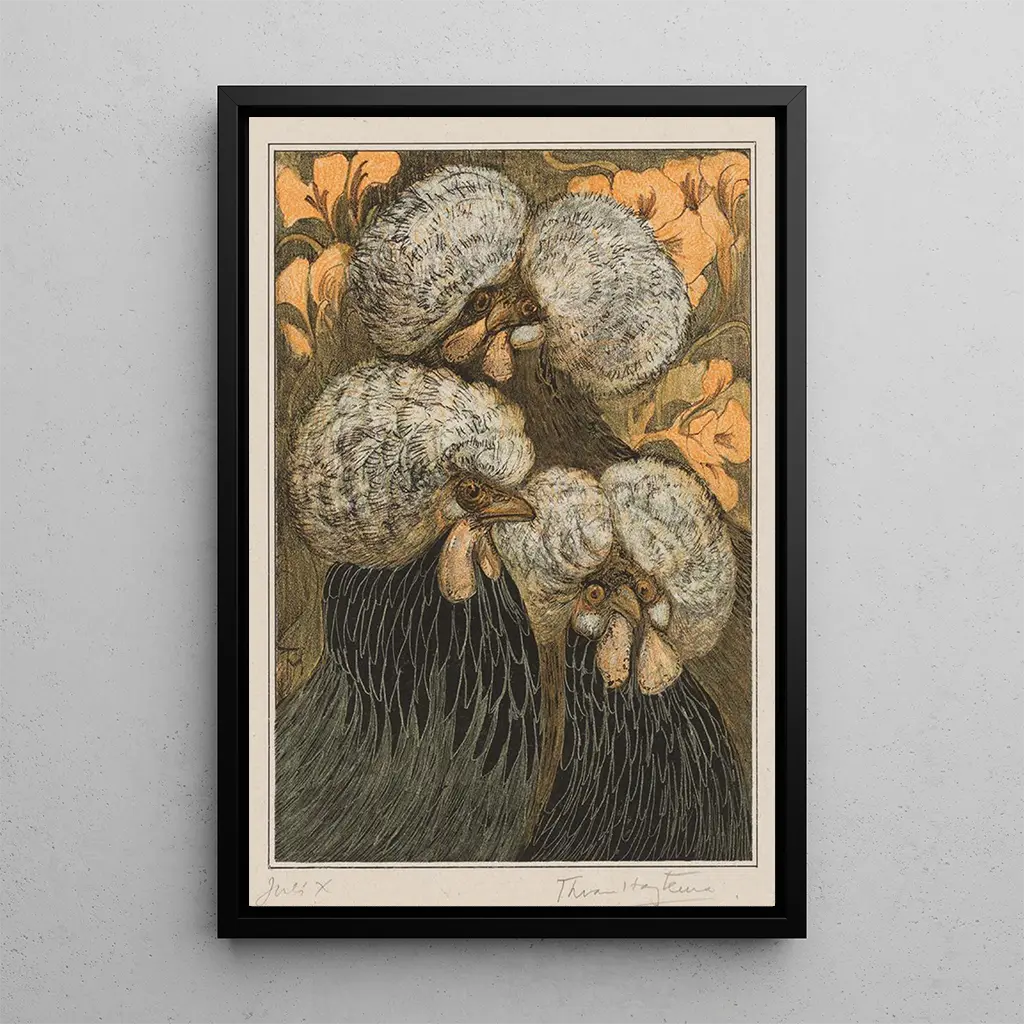 Drie kuikens met kuif: een tedere blik op het plattelandsleven In deze kunstdruk van Drie kuikens met kuif biedt Theo van Hoytema ons een charmante en levendige scène, waar de kippen, met hun gekleurde veren en nieuwsgierige houding, onder onze ogen tot leven lijken te komen. De minutieuze details van elk dier, gecombineerd met zachte en natuurlijke tinten, creëren een gezellige en vrolijke sfeer. De kunstenaar slaagt erin niet alleen de fysieke verschijning van de kippen vast te leggen, maar ook hun speelse karakter, waardoor dit werk zowel speels als poëtisch is. De evenwichtige compositie en de delicate achtergrond benadrukken deze vertrouwde dieren, en vieren zo de eenvoud van het plattelandsleven. Theo van Hoytema: een kunstenaar met een hart voor de natuur Theo van Hoytema, actief aan het einde van de 19e en het begin van de 20e eeuw, is een Nederlandse kunstenaar wiens werk zich vaak richt op fauna en flora. Zijn stijl, beïnvloed door de Art Nouveau, wordt gekenmerkt door vloeiende lijnen en organische patronen. Hoytema wist zich te profileren als een oplettende waarnemer van de natuur, die momenten van het dagelijks leven vastlegt met een unieke gevoeligheid. Zijn werk is breed erkend en gewaardeerd, en maakt hem tot een belangrijke figuur in de wereld van bloem- en dierenkunst. Zijn vermogen om esthetiek en naturalisme te combineren, blijft vele hedendaagse kunstenaars inspireren. Een decoratief kunstdruk met vele voordelen De kunstdruk van Drie kuikens met kuif is een perfecte aanvulling om je interieur op te fleuren, of het nu in een keuken, woonkamer of werkruimte is. De afdrukkwaliteit garandeert een uitzonderlijke trouw aan de kleuren en details van het originele werk, en brengt een frisse toets aan je decoratie. Dit schilderij, met zijn rustieke charme en visuele aantrekkingskracht, zal liefhebbers van dieren en de natuur zeker aanspreken. Door deze doek in je ruimte te integreren, creëer je een warme en uitnodigende sfeer, en vier je de schoonheid van landelijke scènes.