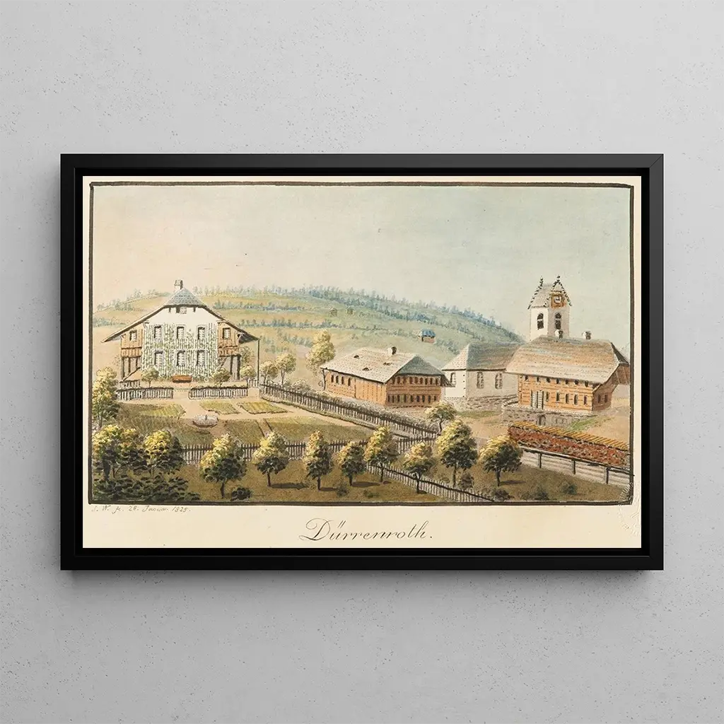 Dürrenroth : een landschap doordrenkt met sereniteit In "Dürrenroth" brengt Jakob Samuel Weibel ons naar een landelijk landschap vol rust en natuurlijke schoonheid. De groene heuvels, gouden velden en bewolkte luchten vermengen zich harmonieus, waardoor een rustige sfeer ontstaat die uitnodigt tot ontsnapping. De techniek van Weibel, gekenmerkt door delicate penseelstreken en een minutieuze aandacht voor details, brengt dit schilderij tot leven, waarbij elk element lijkt te ademen. Dit werk roept een nostalgie op naar de ongerepte natuur en herinnert ons aan het belang van het behouden van deze betoverende landschappen. Jakob Samuel Weibel : een kunstenaar geworteld in zijn tijd Jakob Samuel Weibel, actief in de 19e eeuw, is een Zwitserse kunstenaar wiens werk de invloeden van romantiek en realisme weerspiegelt. Hoewel hij minder bekend is dan sommige van zijn tijdgenoten, heeft Weibel de essentie van Zwitserse landschappen weten vast te leggen met een unieke gevoeligheid. Zijn werk getuigt van een tijd waarin de kunstenaar de natuur wilde weergeven met bijna fotografische fideliteit, terwijl hij er een emotionele dimensie aan toevoegde. Zijn landschappen, zoals "Dürrenroth", zijn waardevolle getuigenissen van de schoonheid van de Alpenlandschappen en het belang van de natuur in de kunst. Een decoratief kunstdruk met vele voordelen De kunstdruk van "Dürrenroth" is een decoratieve keuze die uw interieur zal verfraaien, of het nu een woonkamer, kantoor of slaapkamer is. De rustgevende voorstelling van de natuur brengt een sfeer van kalmte en sereniteit, ideaal om een ontspanningsruimte te creëren. De kwaliteit van deze kunstdruk garandeert een opmerkelijke fideliteit aan het originele werk, waardoor u de schoonheid van Weibel volledig kunt waarderen. Door deze doek in uw decoratie te integreren, voegt u een artistiek accent toe dat uitnodigt tot contemplatie en ontsnapping.
