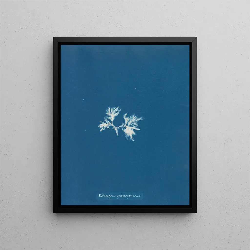 Reproductie Ectocarpus sphaerophorus - Anna Atkins – Boeiende introductie L'œuvre "Ectocarpus sphaerophorus" d'Anna Atkins se présente comme une étape importante dans l'histoire de la photographie botanique, révélant la beauté éthérée des algues marines à travers un prisme artistique. En 1843, Atkins, pionnière dans l'utilisation du procédé du cyanotype, a su capturer avec une délicatesse rare la forme et la texture d'une algue, transformant un simple spécimen naturel en une œuvre d'art. Cette kunstdruk invite à une contemplation silencieuse, où chaque détail semble respirer et vibrer au rythme des marées. À travers cette image, Atkins ne se contente pas de documenter la nature ; elle l'élève au rang d'art, offrant une expérience visuelle qui transcende le temps et l'espace. Stijl en uniekheid van de kunstdruk De stijl van Anna Atkins onderscheidt zich door haar vernieuwende aanpak en haar minutieuze aandacht voor details. De cyanotype, techniek die de zonlicht gebruikt om afdrukken van een diepe blauw te ontwikkelen, geeft haar werken een sfeer die zowel wetenschappelijk als poëtisch is. "Ectocarpus sphaerophorus" wordt gekenmerkt door haar organische vormen, haar nuances van blauw en haar delicate schaduwen, wat een opvallend contrast creëert tussen wetenschappelijke precisie en artistieke vloeiendheid. Elk element van de kunstdruk is zorgvuldig samengesteld, wat een harmonie oproept die de complexiteit en schoonheid van de natuurlijke wereld weerspiegelt. Het ontbreken van kleur, benadrukt door de cyanotype, maakt het mogelijk de aandacht te richten op de structuur en de silhouet van de alg, waardoor de kunstdruk tijdloos en universeel wordt. De kunstenaar en haar invloed Anna Atkins, vaak beschouwd als de eerste vrouwelijke fotograaf, wist haar tijd te markeren met haar durf en visie. Haar werk gaat verder dan eenvoudige documentatie; ze heeft de weg geopend naar een nieuwe manier om de natuur waar te nemen, waar kunst en wetenschap samenkomen. Door botanische elementen in haar creaties te integreren, heeft ze niet alleen het domein van de fotografie verrijkt, maar ook generaties van kunstenaars en wetenschappers beïnvloed. Haar nalatenschap blijft voortbestaan, en inspireert degenen die de relatie tussen mens en natuur willen verkennen door het artistieke prisma.