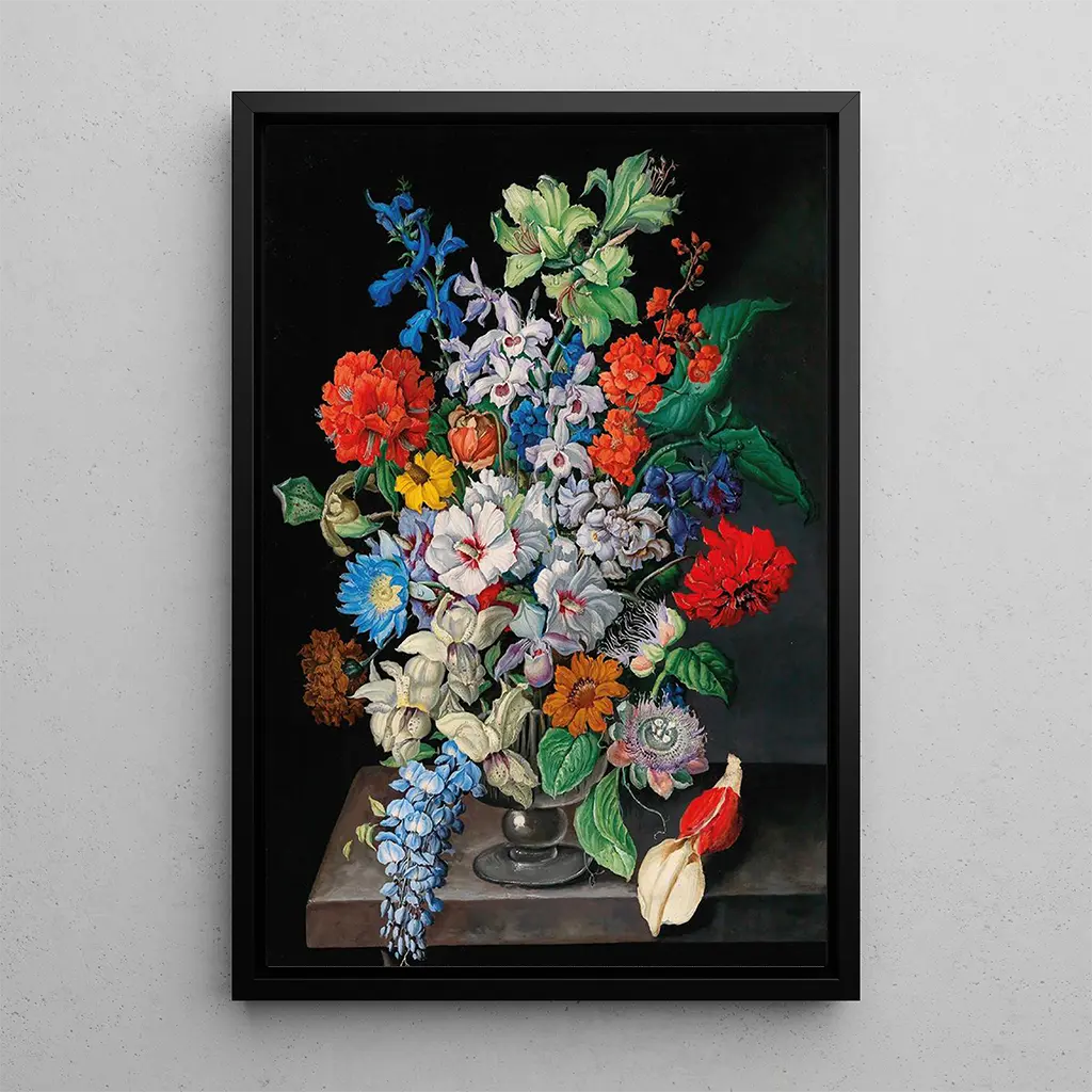 In dit levendige kunstwerk nodigt Sebastian Wegmayr ons uit om onder te dompelen in een weelderig bloemenuniversum. Het schilderij "Een groot boeket bloemen" onderscheidt zich door zijn sprankelende palet, waar de heldere tinten van de bloemblaadjes harmonieus verweven zijn. De olieverftechniek die door de kunstenaar wordt gebruikt, stelt hem in staat om het licht en de textuur van de bloemen vast te leggen, waardoor een sfeer ontstaat die zowel vrolijk als rustgevend is. Elk detail, van delicate nuances tot subtiele schaduwen, draagt bij aan het tot leven brengen van deze compositie, waardoor deze kunstdruk een ware ode wordt aan de schoonheid van de natuur.