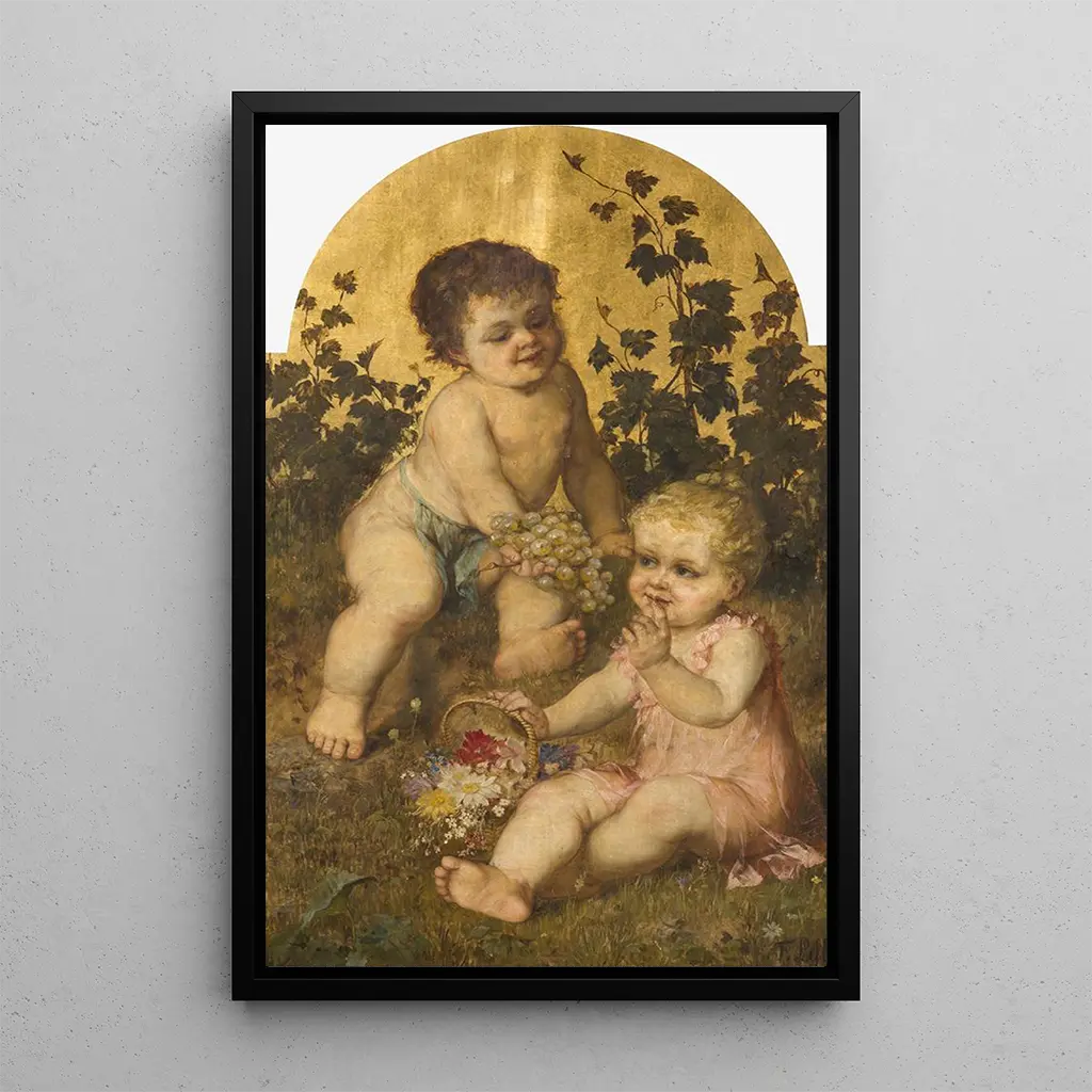 In deze kunstdruk van Een jonge wijnboer vangt kunstenaar Franz Lefler de essentie van de wijnbouw door een jonge man met een vastberaden blik. De warme, aardse kleuren, gemengd met groene accenten, roepen de rijkdom van de wijngaarden en de belofte van een overvloedige oogst op. Lefler's techniek, die realisme en romantiek combineert, creëert een levendige, bijna tastbare sfeer waarin je de geur van rijp druif kunt ruiken en het zachte geruis van de wind door de bladeren kunt horen. Dit schilderij, een ware ode aan de aarde en haar arbeid, nodigt uit tot contemplatie en waardering van oude ambachten.
