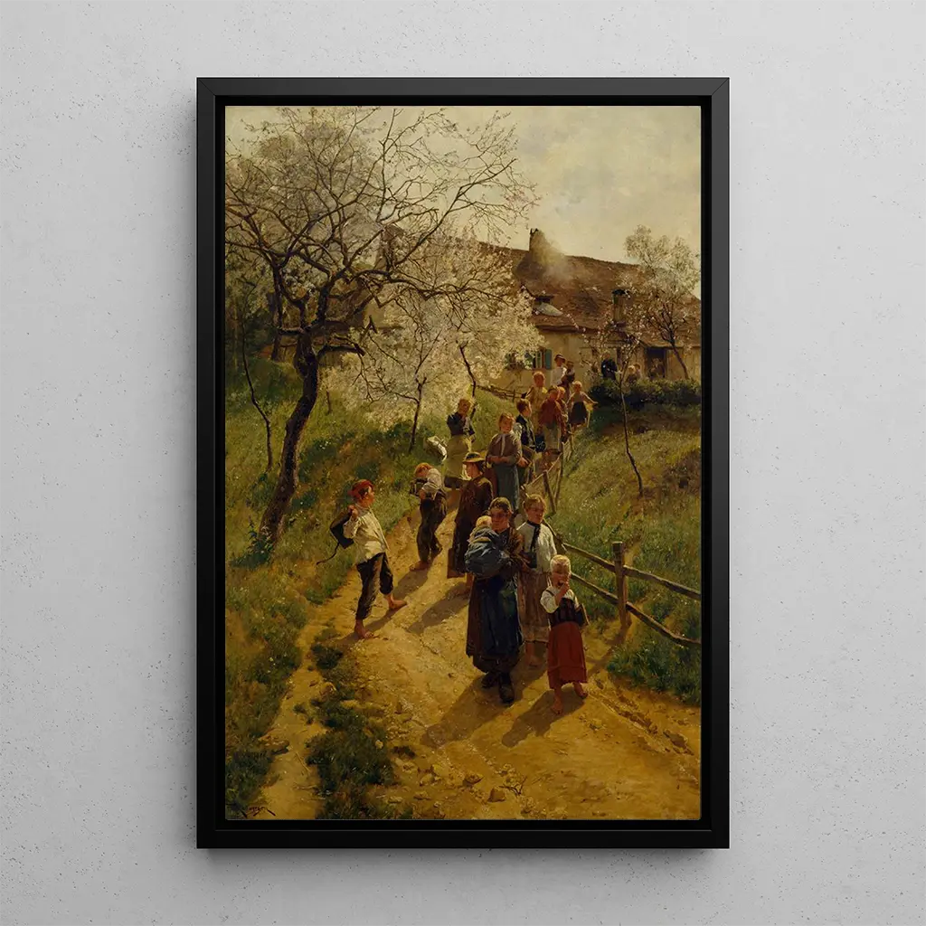 Friedrich Kallmorgen, Duitse schilder uit de 19e eeuw, staat bekend om zijn poëtische landschappen. Geïnspireerd door de romantiek, behoort hij tot een traditie die de schoonheid van de natuur waardeert. Zijn carrière, gekenmerkt door reizen door Europa, stelt hem in staat om diverse technieken en stijlen te verkennen, terwijl hij trouw blijft aan zijn liefde voor natuurlijke landschappen. Kallmorgen wist de essentie van de seizoenen vast te leggen, en "Een lentedag" is daar een perfect voorbeeld van, getuigend van zijn vaardigheid om emoties op te roepen door scènes uit het dagelijks leven.