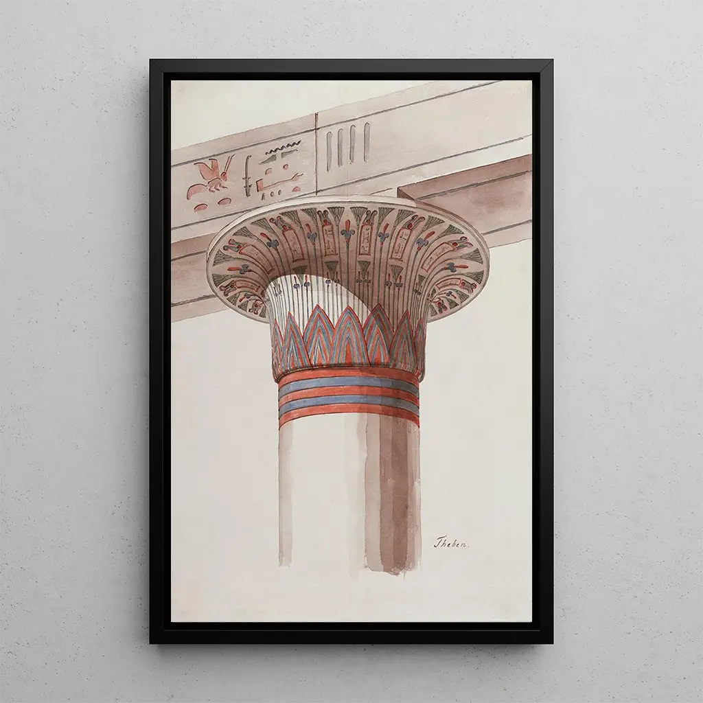 Deze kunstdruk van een kapiteel uit Thebe roept de grootsheid en verfijning van de Egyptische architectuur op. De bloemmotieven en elegante lijnen getuigen van uitzonderlijk vakmanschap, terwijl de natuurlijke kleuren de materialen benadrukken die werden gebruikt bij de bouw van tempels. De sfeer die door dit werk wordt opgeroepen, is doordrenkt met mysterie en majesteit, en nodigt de kijker uit om onder te dompelen in de fascinerende geschiedenis van het oude Egypte. De fijnheid van de details en de precisie van de vormen maken van dit doek een waar meesterwerk dat de essentie van de antieke kunst vastlegt.