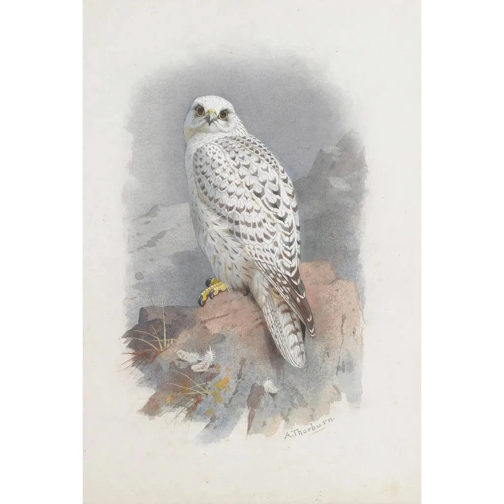 Archibald Thorburn, artiste britannique du début du XXe siècle, est reconnu pour ses représentations d'animaux dans leur habitat naturel. Influencé par le mouvement naturaliste, il a su allier précision scientifique et sensibilité artistique. Sa carrière, marquée par des illustrations pour des ouvrages ornithologiques, témoigne de son engagement envers la conservation de la faune. "Un faucon du Groenland" s'inscrit dans une période où la nature était de plus en plus menacée par l'industrialisation. Thorburn, par son art, a contribué à sensibiliser le public à la beauté et à la fragilité de ces espèces.