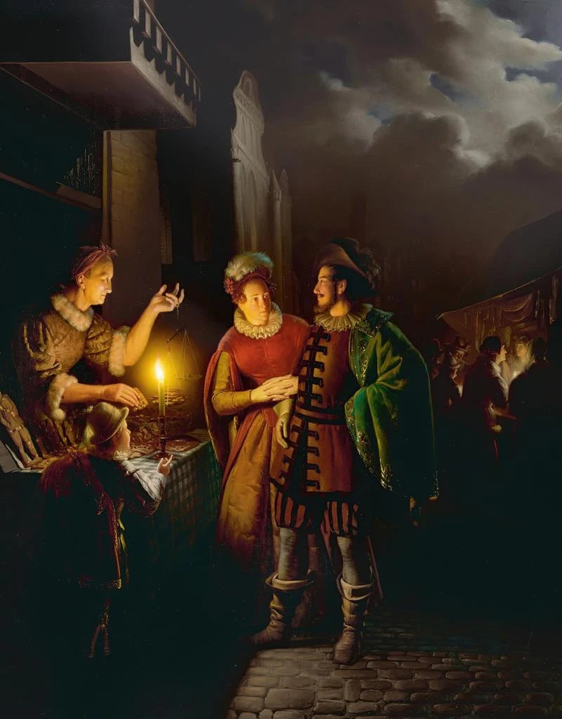 Een verkoper van peperkoek bij het licht van kaarsen - Petrus van Schendel