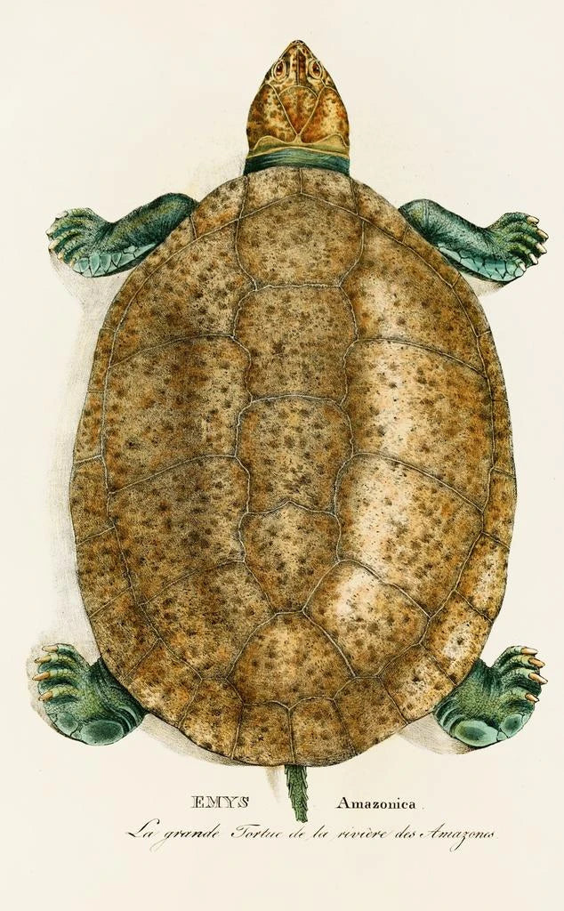 De kunstdruk van Emys Amazonica, vervaardigd door Johann Baptist von Spix, voert ons mee naar de diepten van de Amazone, waar de biodiversiteit overvloedig is. Dit schilderij benadrukt een zoetwaterkikker, die de gratie en elegantie van dit fascinerende dier vastlegt. De aardse kleuren en de tinten groen roepen de rijkdom van zijn natuurlijke habitat op, terwijl de gedetailleerde weergave van de schildpad en de waterreflecties een meeslepende sfeer creëren. Het werk, zowel wetenschappelijk als artistiek, nodigt uit tot een respectvolle contemplatie van de natuur en haar wonderen.
