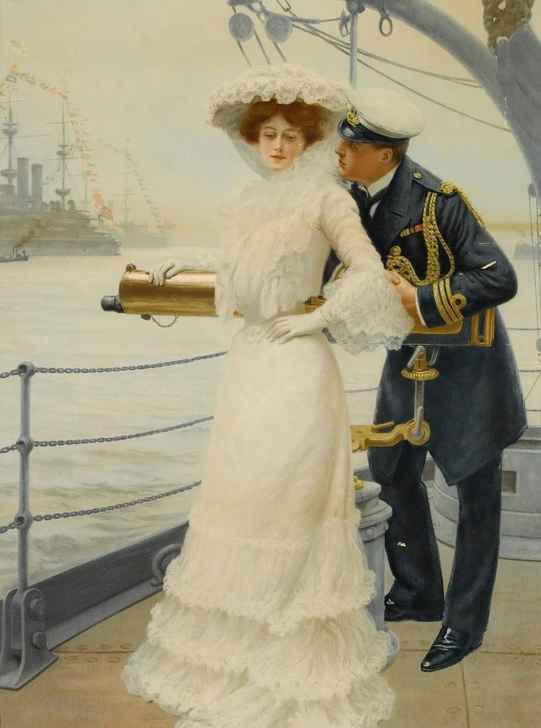 Het werk onderscheidt zich door zijn realistische benadering, typisch voor de Engelse school, die weet het leven in al zijn pracht vast te leggen. Het spel van licht en schaduw, evenals de fijnheid van de details, getuigt van een onmiskenbare technische beheersing. De personages, gepresenteerd in een rustige houding, lijken zich over te geven aan de zachtheid van een moment van rust. Het kleurenpalet, zowel zacht als warm, creëert een serene sfeer die uitnodigt tot ontsnapping. Elk element van de compositie, van de kleding van de figuren tot de omringende objecten, draagt bij aan het versterken van dit gevoel van rust en contemplatie. Het vermogen van de kunstenaar om emoties op te roepen door middel van kleur en licht maakt van dit werk een ware uitnodiging tot dromerij.