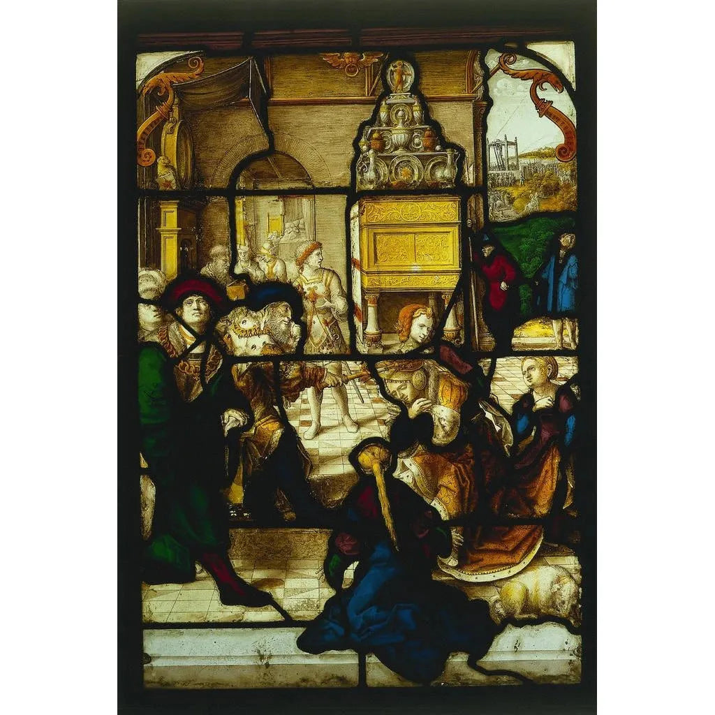 L'œuvre "Esther voor Assuérus" van Dirk Vellert vangt een cruciaal moment uit de Bijbel, waarin koningin Esther voor koning Assuérus staat. De compositie wordt gekenmerkt door een rijke kleurenpalet, van schitterende goudaccenten tot diepe tinten in de kleding van de personages. Vellert gebruikt een olieverftechniek die de uitdrukkingen van de protagonisten tot leven brengt, en zo een sfeer creëert die zowel plechtig als emotioneel geladen is. De minutieuze details van gezichten en plooien voegen een bijna theatrale dimensie toe aan de scène, en nodigen de kijker uit om de voelbare spanning van dit belangrijke moment te ervaren.