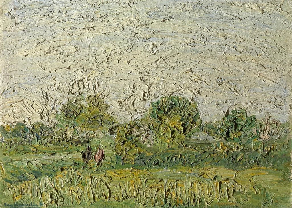 De kunstdruk "Été" roept de zoetheid en warmte op van zonnige dagen, waarop het licht danst op groene landschappen. De levendige kleuren, variërend van stralend geel tot diepe groenen, creëren een vrolijke en uitnodigende sfeer. De gebruikte techniek, waarschijnlijk olieverf, maakt het mogelijk om de helderheid en textuur van natuurlijke elementen vast te leggen. Elke penseelstreek lijkt de lucht te doordrenken met een gevoel van lichtheid, waardoor de kijker wordt uitgenodigd om in deze idyllische scène onder te dompelen. "Été" is meer dan een eenvoudige voorstelling; het is een uitnodiging om te genieten van de eenvoudige geneugten van het seizoen.