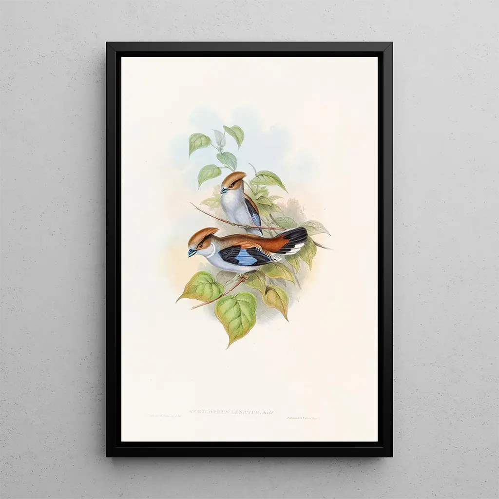 John Gould, célèbre ornithologue et illustrateur du XIXe siècle, a joué un rôle crucial dans la documentation des espèces aviaires. Son travail, influencé par les explorations scientifiques de son temps, a permis de faire connaître des oiseaux rares et exotiques au grand public. Eurylaime luné fait partie de ses œuvres marquantes, illustrant non seulement la beauté de la nature, mais aussi l'importance de la conservation des espèces. Gould a su allier art et science, faisant de ses illustrations des références pour les naturalistes et les amateurs d'art.