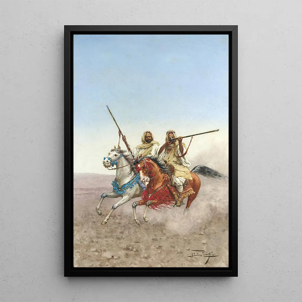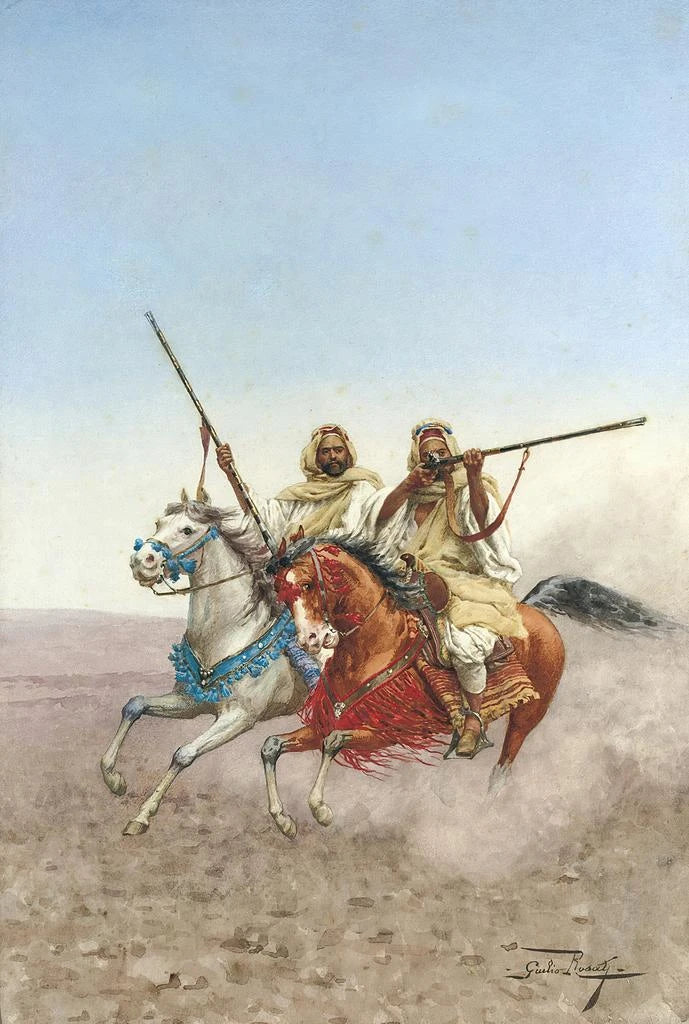 Giulio Rosati, Italiaanse schilder uit de 19e eeuw, is vooral bekend om zijn orientalistische kunstdrukken die de schoonheid en het exotisme van oosterse culturen vastleggen. Zijn carrière werd gekenmerkt door een reeks reizen die zijn kunst diepgaand hebben beïnvloed. Rosati wist elementen uit de Arabische en Noord-Afrikaanse cultuur te integreren in zijn composities, terwijl hij een verfijnde technische aanpak behield. Zijn stijl, gekenmerkt door levendige kleuren en minutieuze details, maakte hem tot een iconisch vertegenwoordiger van het Orientalisme, een artistieke beweging die Europa van die tijd fascineerde.