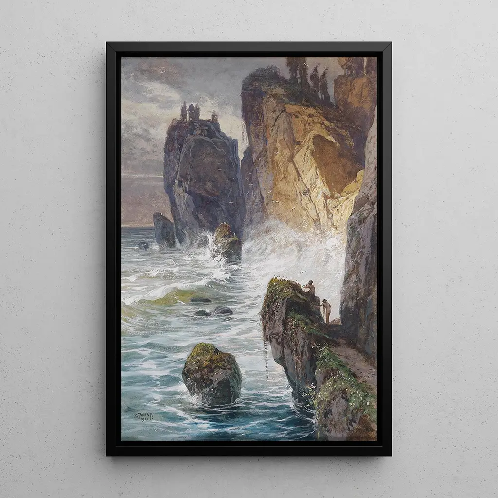"Faunes sur une côte rocheuse" de Georg Janny est une œuvre captivante qui évoque une scène mythologique où des faunes, créatures à moitié humaines, se mêlent à la beauté sauvage de la nature. Les couleurs vibrantes et les jeux de lumière sur les rochers et l'eau créent une atmosphère vivante et dynamique. La composition, riche en détails, invite le spectateur à explorer les interactions entre les faunes et leur environnement, symbolisant l'harmonie entre l'homme et la nature. La technique de Janny, alliant réalisme et touches impressionnistes, donne vie à cette scène enchantée, pleine de mouvement et de mystère.