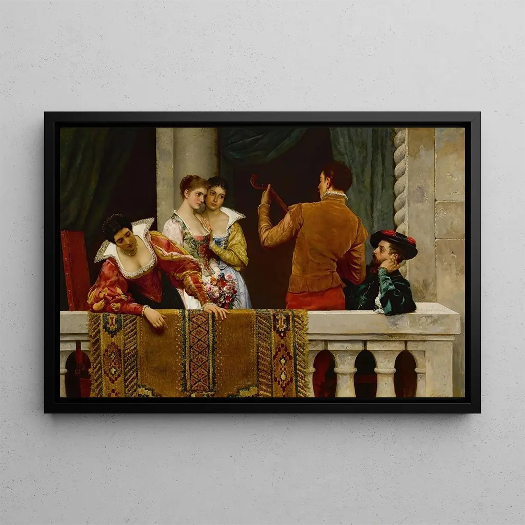 In dit levendige kunstwerk legt de schilder de essentie van Venetië vast, waar de gondels rustig glijden over de glinsterende kanalen. De heldere kleuren, variërend van diepe blauwen tot vurige roodtinten, creëren een feestelijke en vrolijke sfeer. De gebruikte techniek, waarschijnlijk olieverf op doek, maakt het mogelijk om het licht bijna magisch weer te geven, waardoor elk detail van deze levendige scène wordt verlicht. De personages, gekleed in traditionele kostuums, lijken te dansen op het ritme van de muziek en nodigen de kijker uit om onder te dompelen in dit tijdloze feest.