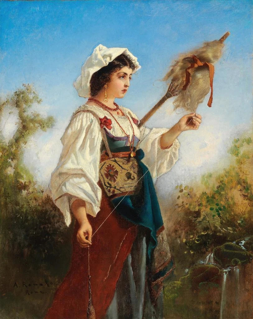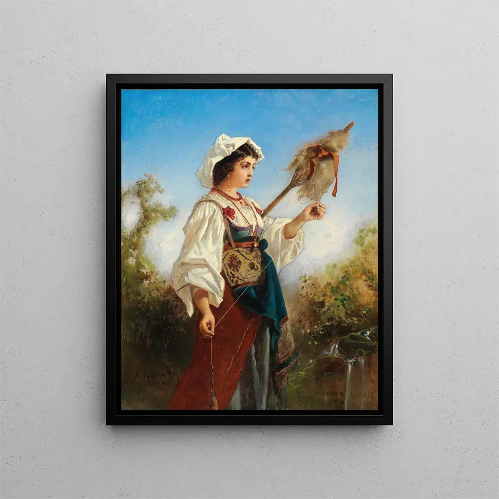 Anton Romako, een Oostenrijkse schilder, wist zich te vestigen op het artistieke toneel van de 19e eeuw dankzij zijn vernieuwende aanpak en zijn gevoeligheid voor de onderwerpen die hij koos. Geïnspireerd door het realisme en het romantisme, wist Romako deze stromingen te combineren om werken te creëren die tot de ziel spreken. Zijn fascinatie voor het leven van gewone mensen, en vooral voor de rol van vrouwen, komt terug in verschillende van zijn creaties. "Fileuse romaine" past perfect binnen deze benadering,