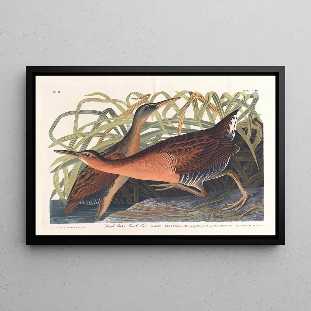 De kunstdruk Râle d'eau douce van John James Audubon vangt de schoonheid en de fijnheid van de Amerikaanse fauna. Met levendige kleuren en minutieuze details stelt dit werk een watervogel voor in zijn natuurlijke habitat, en roept een rustige en sereuze sfeer op. De nuances van groen en bruin mengen harmonieus, terwijl het licht speelt op de veren van de vogel en de textuur accentueert. Audubon, bekend om zijn wetenschappelijke en artistieke benadering, slaagt erin een gevoel van beweging en leven over te brengen, en nodigt de kijker uit zich onder te dompelen in dit stukje natuur.