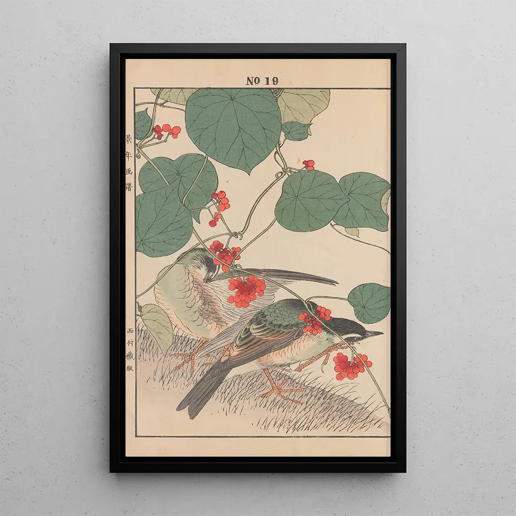 De kunstdruk van Keinen kach gafu Pl143 dompelt ons onder in een wereld waar de delicatessen van bloemen en de fijnheid van details verweven zijn. De pastelkleuren, zacht en rustgevend, roepen een serene, bijna meditatieve sfeer op. De techniek van de ukiyo-e op papier, typisch voor de Japanse kunst, laat de lichtheid van de bloemblaadjes en de vloeiendheid van de vormen voelen. Elk element is zorgvuldig samengesteld, wat een harmonieuze balans creëert die uitnodigt tot contemplatie. Dit werk is een ware ode aan de vergankelijke schoonheid van de natuur, dat de essentie van de seizoenen vastlegt met opmerkelijke precisie.