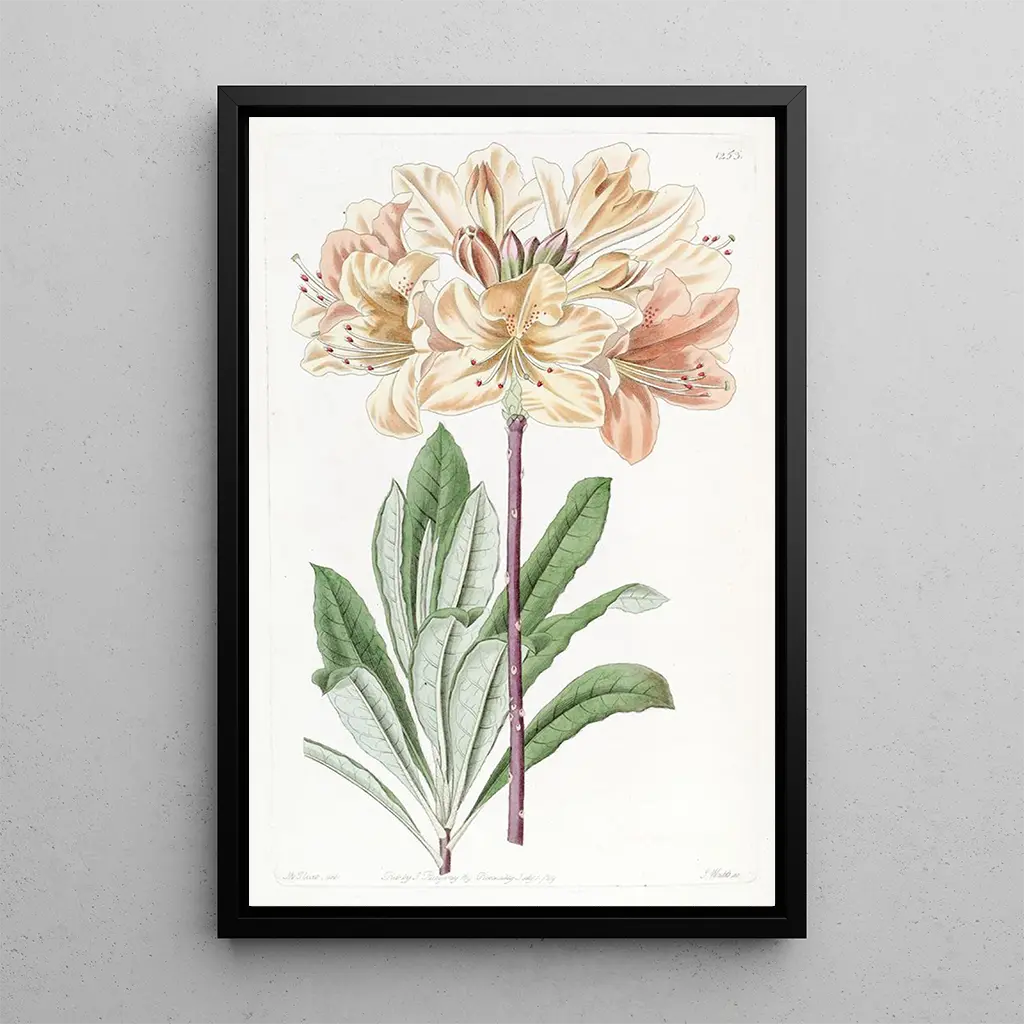 De Azalée geel uit China, een delicate kunstdruk van Sydenham Edwards, roept de vergankelijke schoonheid van een bloeiend voorjaar op. Deze kunstdruk benadrukt levendige tinten van geel en groen, waardoor een lichte en vrolijke sfeer ontstaat. De aquareltechniek, met haar subtiele nuances en zachte gradaties, maakt het mogelijk de lichtheid van de bloemblaadjes vast te leggen, bijna in de lucht zwevend. Elk detail wordt minutieus weergegeven, van de nerven van de bladeren tot de schaduwen, en nodigt uit tot contemplatie van de natuur.