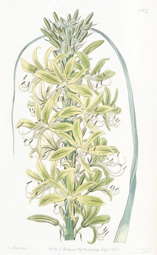 Sydenham Edwards, illustrateur botanique du début du XIXe siècle, a marqué son époque par ses œuvres précises et poétiques. Son approche scientifique, combinée à un sens artistique aigu, lui a permis de créer des illustrations qui sont à la fois informatives et esthétiques. L'Asphodèle jaune de Sibérie, comme d'autres de ses œuvres, témoigne de son engagement à représenter la nature avec fidélité. Edwards a également joué un rôle clé dans l'éducation botanique, rendant ses illustrations accessibles à un large public et contribuant à la popularisation des sciences naturelles.
