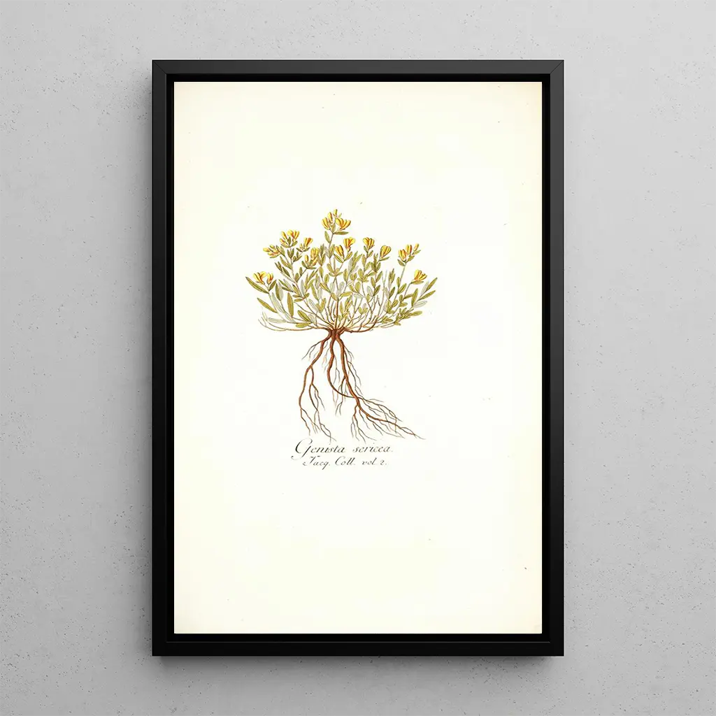 De kunstdruk van Genista sericea brengt ons in een rijke en boeiende bloemenwereld. Dit werk van Nikolaus Joseph Freiherr von Jacquin onthult delicate bloemen met gouden nuances, die gracieus bloeien. De aquareltechniek, beheerst door de kunstenaar, geeft elk element een lichtheid en vloeiendheid, waardoor een bijna dromerige sfeer ontstaat. Het werk nodigt uit tot een rustige contemplatie, waarin de schoonheid van de natuur wordt benadrukt met een opmerkelijk gevoel voor subtiliteit.