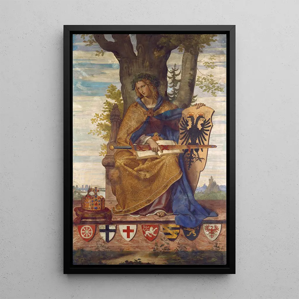 In het kunstdruk Germania dompelt Philipp Veit ons onder in een symbolische voorstelling van Duitsland. De compositie wordt gedomineerd door heldere kleuren en opvallende contrasten, waar rood, zwart en goud harmonieus samenkomen. De centrale figuur, majestueus en vrouwelijk, belichaamt de nationale geest, omringd door natuurlijke elementen die de rijkdom van het Duitse landschap oproepen. Veit's techniek, die romantiek combineert met neoclassicistische invloeden, creëert een sfeer die zowel plechtig als inspirerend is, en nodigt de kijker uit tot reflectie over identiteit en geschiedenis.