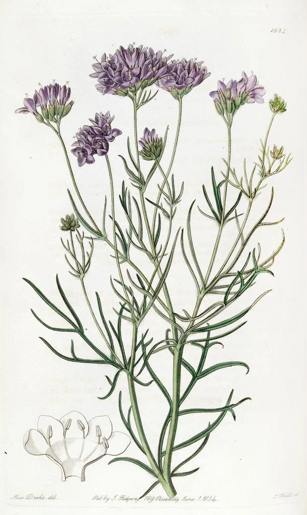 Sydenham Edwards, illustrateur botanique du début du XIXe siècle, a marqué son époque par son approche unique de la représentation des plantes. Son travail s’inscrit dans un contexte où la botanique connaît un essor grâce aux explorations et aux découvertes de nouvelles espèces. Edwards a su allier rigueur scientifique et sensibilité artistique, ce qui lui a permis de créer des œuvres d’une grande précision. La Gilia à feuilles de millefeuille est emblématique de son style, alliant détails minutieux et compositions harmonieuses, témoignant de son talent et de sa passion pour la nature.