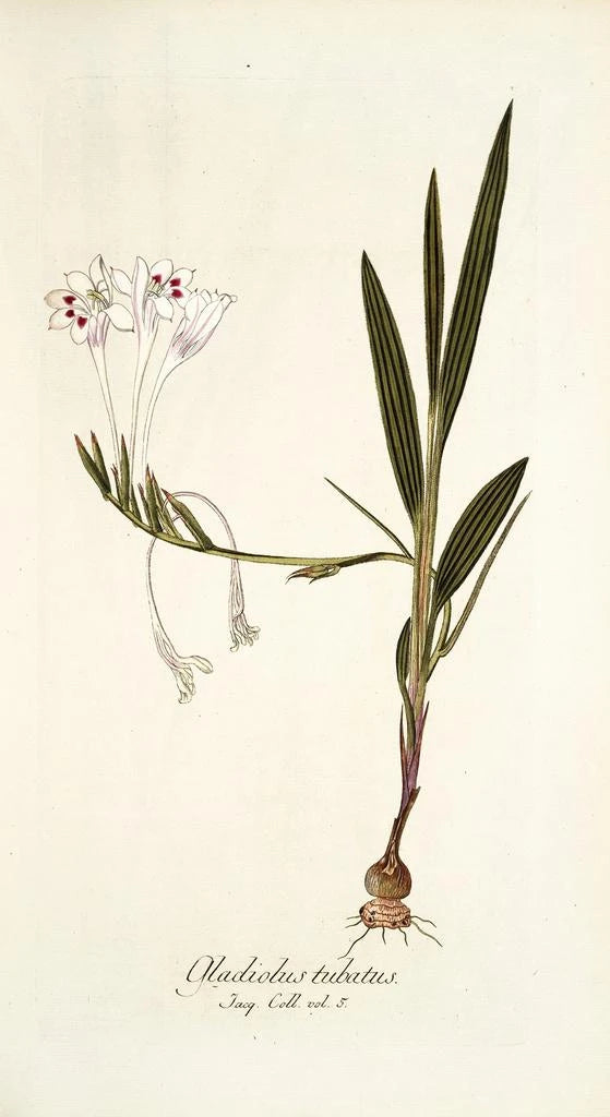 Nikolaus Joseph Freiherr von Jacquin, botanist en kunstenaar uit de achttiende eeuw, wist kunst en wetenschap op een vernieuwende manier te combineren. Opgeleid in Wenen, werd hij beïnvloed door de botanische ontdekkingen van zijn tijd, en streefde hij ernaar de schoonheid van planten te vereeuwigen in zijn werken. Gladiolus tubatus is een perfect voorbeeld van zijn aanpak, waarbij hij een getrouwe weergave van de bloemen combineert met een verfijste esthetiek. Zijn werk heeft niet alleen de wereld van de kunst verrijkt, maar heeft ook bijgedragen aan de vooruitgang van botanische kennis, waardoor hij een pionier in dit vakgebied is geworden.