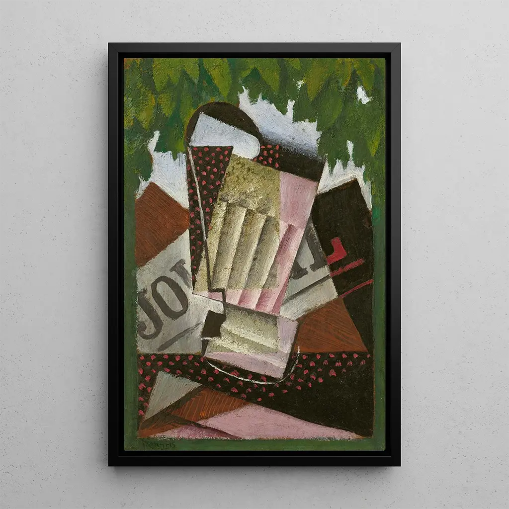 Juan Gris, een belangrijke figuur in het kubisme, wist de perceptie van stillevens te transformeren door zijn kunst. Geboren in Madrid, vestigt hij zich in Parijs waar hij invloedrijke kunstenaars ontmoet die zijn stijl zullen vormen. Zijn vermogen om de invloeden van het kubisme te synthetiseren en tegelijkertijd zijn eigen persoonlijke toets toe te voegen, stelde hem in staat zich te onderscheiden. "Verre, krant en blad" illustreert perfect zijn innovatieve aanpak, die abstractie en representatie combineert, en getuigt van zijn essentiële rol in de evolutie van de moderne kunst aan het begin van de 20e eeuw.