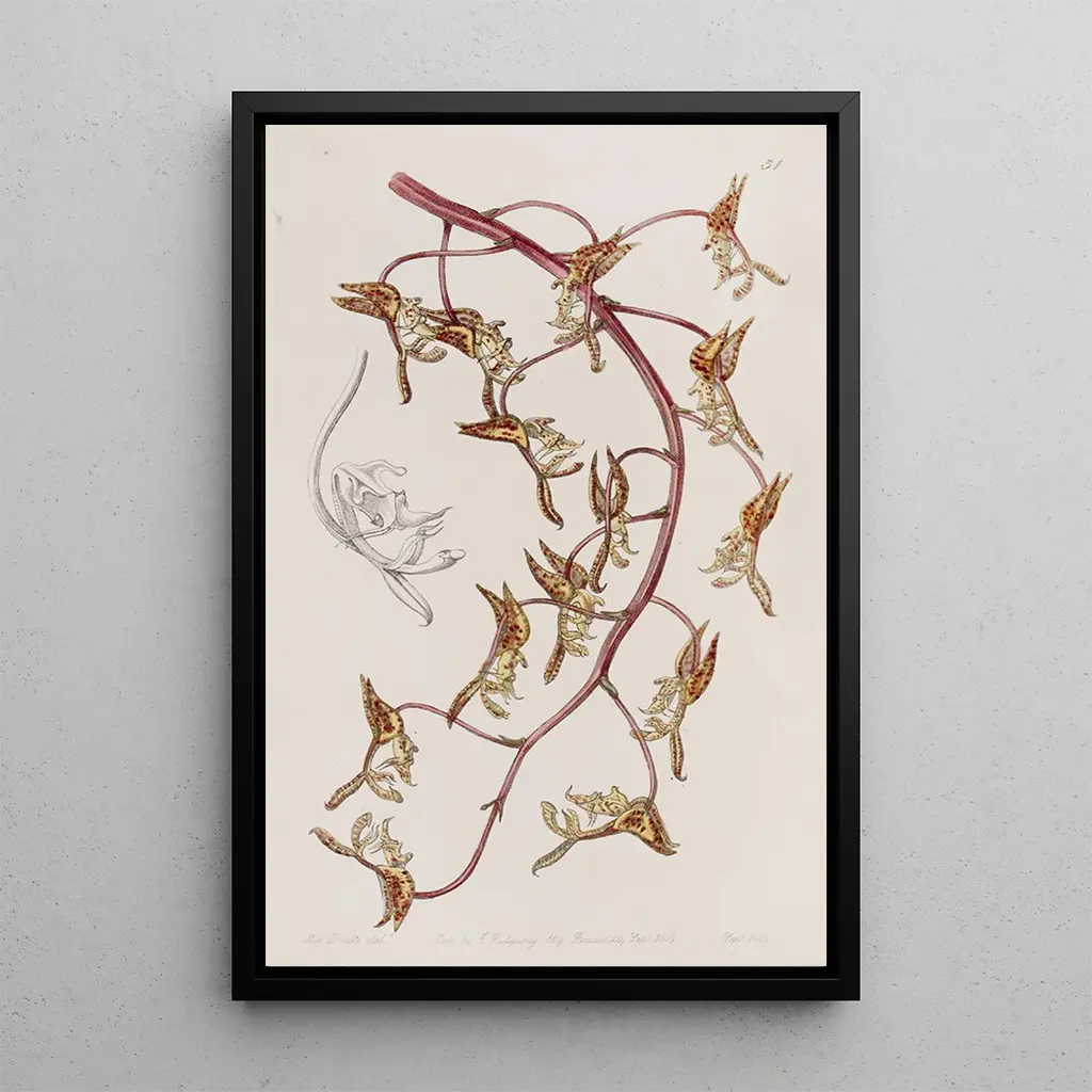 De kunstdruk van het werk "Gongora à fleurs fauves" van Sydenham Edwards dompelt ons onder in een levendige en weelderige wereld. De bloemen, met hun heldere tinten geel, oranje en rood, lijken te dansen onder het licht, en creëren een sfeer die zowel vrolijk als rustgevend is. De aquareltechniek, vakkundig toegepast, maakt het mogelijk om de delicatesse van de bloemblaadjes vast te leggen terwijl er een indrukwekkende diepte wordt geboden. Elk detail, van de contouren van de bloemen tot de nuances van de bladeren, getuigt van een minutieuze observatie van de natuur, en nodigt de kijker uit tot een langdurige contemplatie van deze bloemrijke schoonheid.