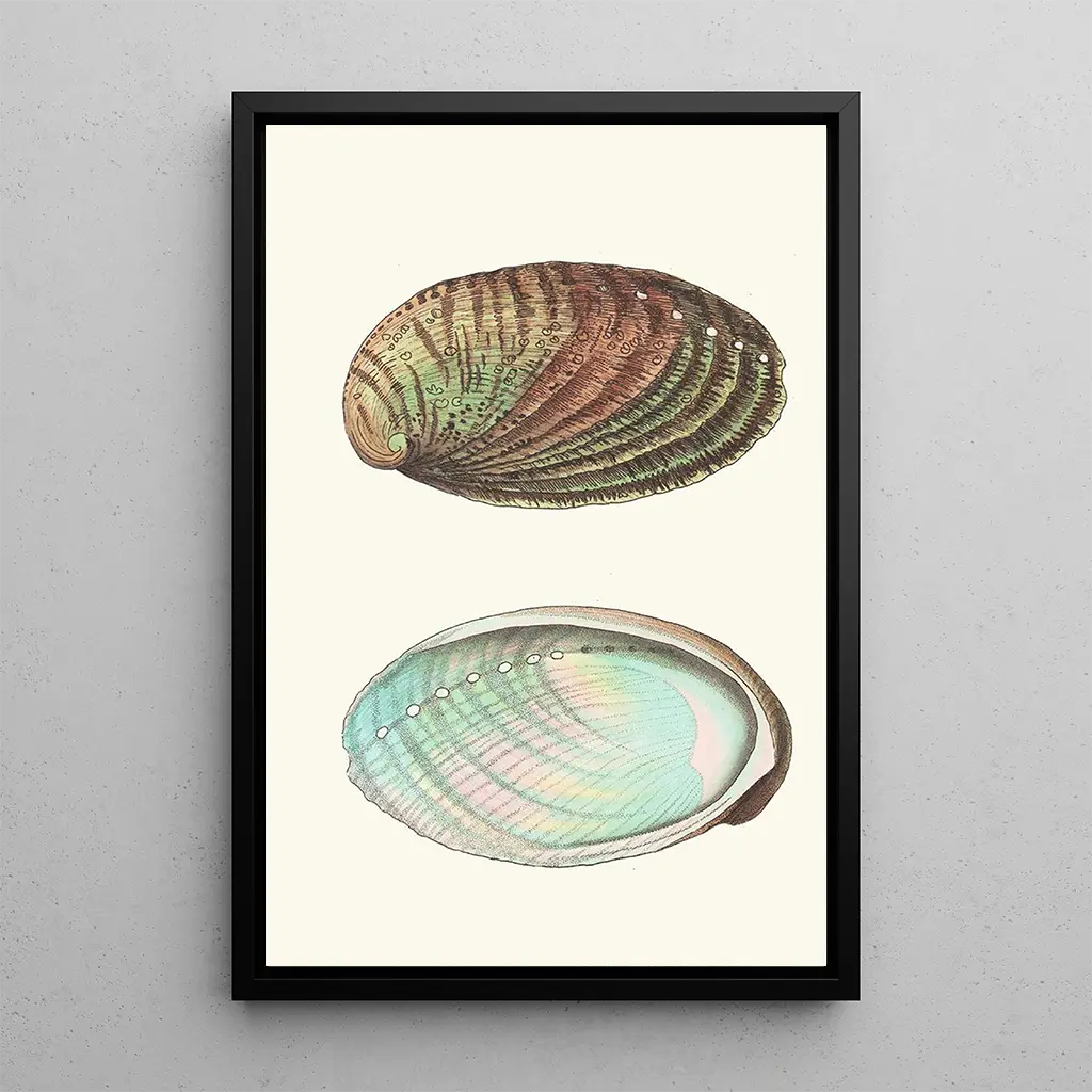De kunstdruk van Haliotis tuberculée, vervaardigd door George Shaw, dompelt ons onder in een fascinerend onderwateruniversum. Dit kunstwerk benadrukt de natuurlijke schoonheid van de abalone, een weekdier met levendige kleuren en delicate texturen. De nuances van blauw, groen en parelmoer mengen harmonieus, waardoor een rustgevende en boeiende sfeer ontstaat. Shaw, met zijn talent als illustrator, slaagt erin om de minutieuze details van de schelp vast te leggen, en nodigt de kijker uit tot een aandachtige en verwonderde contemplatie.
