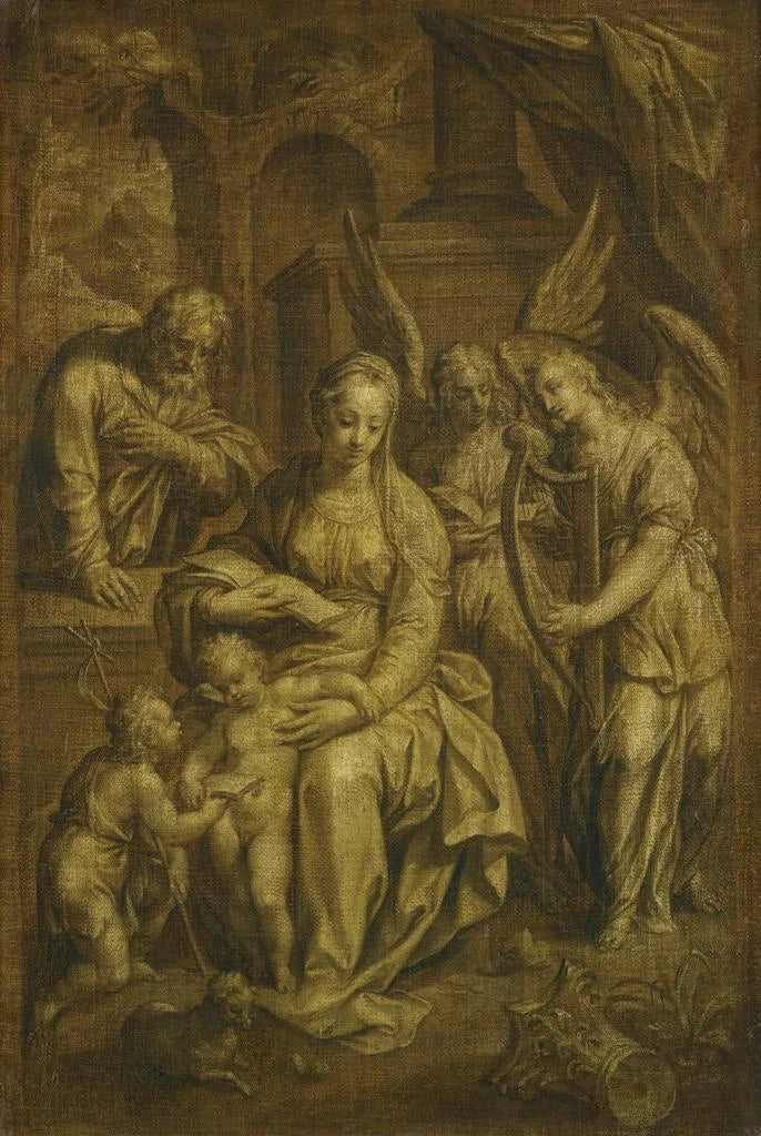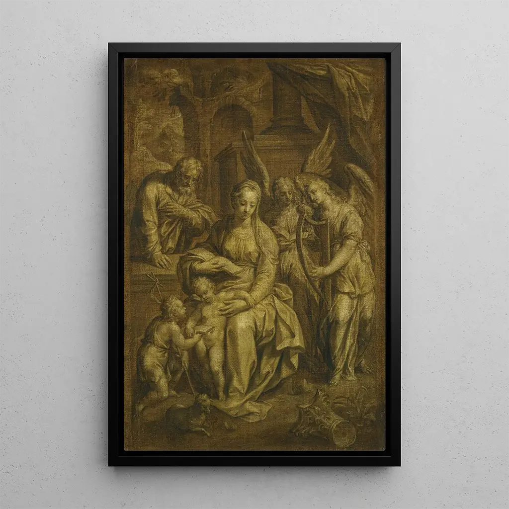 Schilderij Heilige Familie met engelen - Hendrik de Clerck | Kunstdruk
