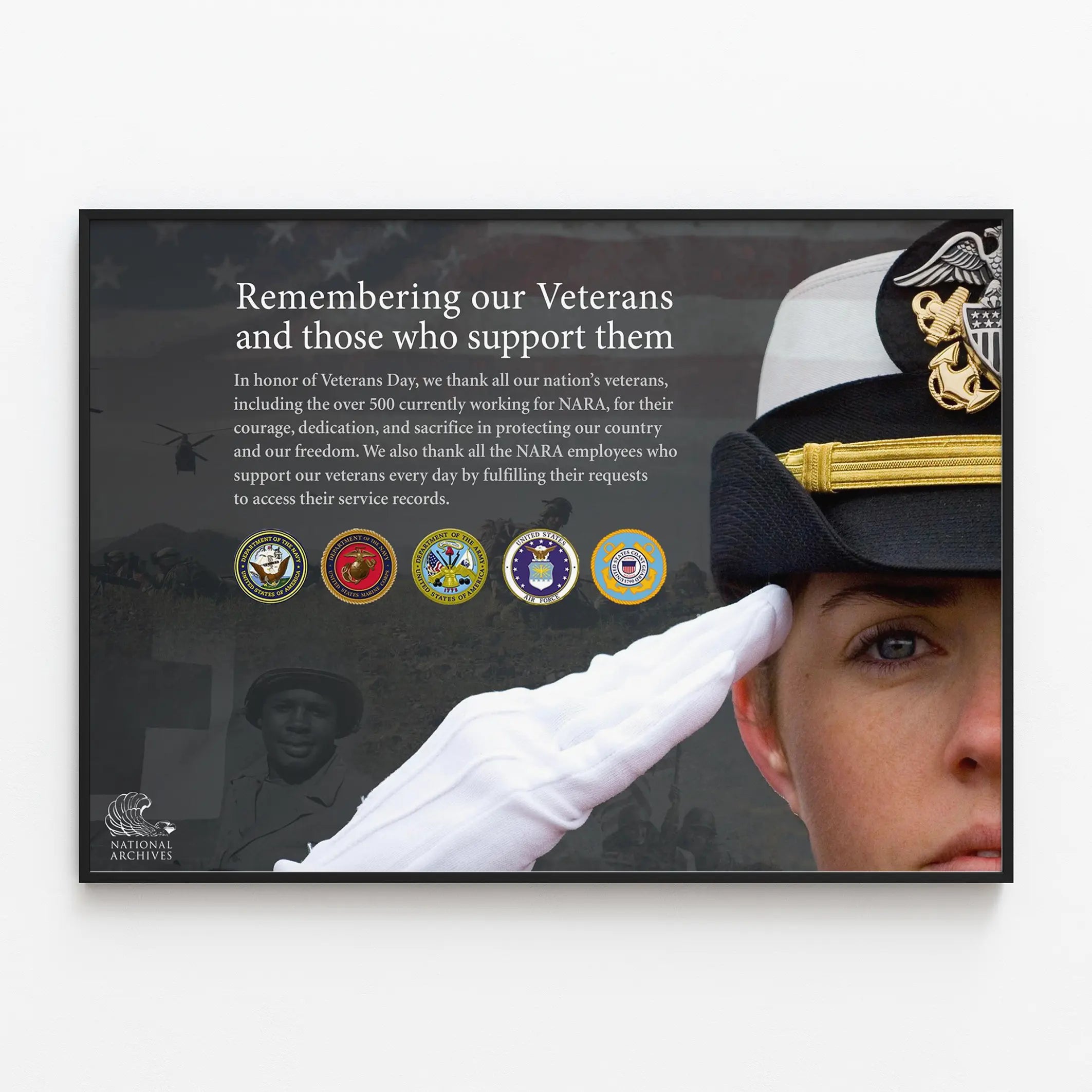 Deze herdenkingsposter voor Veteranendag is een uniek wanddecoratiestuk gewijd aan het eerbetoon aan veteranen en degenen die hen ondersteunen. Met een ontroerende foto van een militair in uniform die groet, wordt dit krachtige visuele element versterkt door een achtergrond in een serieuze en respectvolle tint, waarop soldaten in missie en officiële emblemen van verschillende takken van het Amerikaanse leger te zien zijn. De samenstelling van de poster benadrukt een boodschap in het Engels die eer betuigt aan het moed, de toewijding en de offers van veteranen die de natie en de vrijheid van hun land beschermen. De affiche roept ook dankbaarheid op voor de toegewijde medewerkers die veteranen ondersteunen door het vergemakkelijken van toegang tot hun dienstdossiers. Ideaal voor een wanddecoratie in een institutionele, educatieve of persoonlijke omgeving, deze poster brengt een plechtige en respectvolle sfeer in de ruimtes waar hij wordt tentoongesteld. Het gebruik ervan is perfect voor vieringen, herdenkingen of als decoratief element om bewustzijn te creëren en het belang van veteranen in de samenleving te herinneren. De officiële badges onderaan de poster voegen een gevoel van authenticiteit toe en versterken het officiële karakter van de boodschap. Kortom, deze wanddecoratie is een symbolische keuze om helden uit het leger te eren, betekenis te geven aan interieurdecoratie en herinnering en respect te stimuleren via een betekenisvolle afbeelding en een betrokken tekst.
