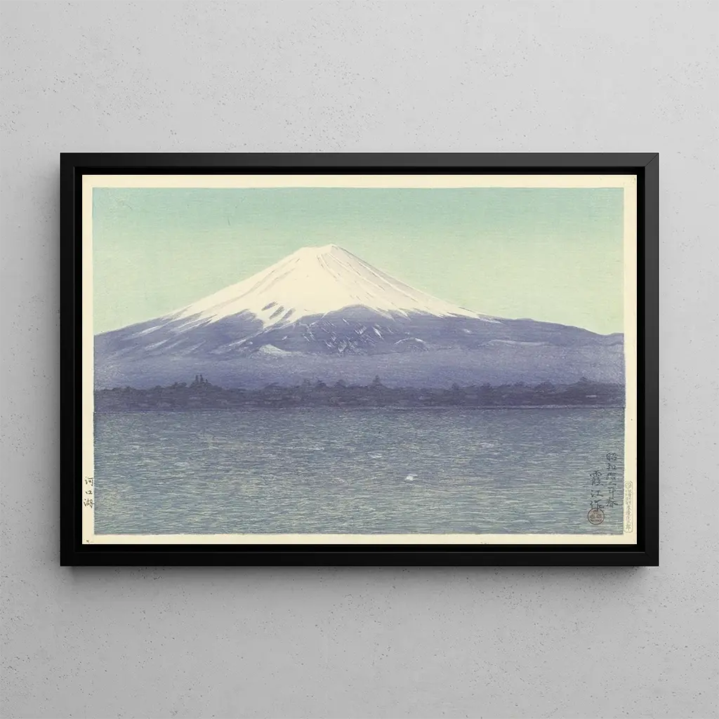 De kunstdruk Le lac Kawaguchi van Shōzaburō Watanabe vangt de essentie van een Japans landschap doordrenkt met rust. De zachte tinten blauw en groen mengen harmonieus, en roepen de sereniteit op van dit iconische meer, met op de achtergrond de majestueuze Mount Fuji. De techniek van de ukiyo-e houtdruk, kenmerkend voor de Japanse kunst, geeft het werk een unieke diepte en textuur. De subtiel weergegeven reflecties op het water nodigen de kijker uit tot een rustige, bijna meditatieve contemplatie. Dit kunstwerk, zowel eenvoudig als complex, brengt de toeschouwer in een bevroren moment, waar natuur en kunst samenkomen.