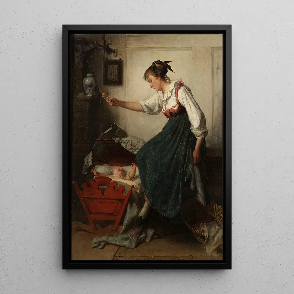 Het nieuwe rammelaar: een scène van familietederheid In dit delicate werk vangt Théodore Gérard een intiem moment tussen een moeder en haar kind. De compositie is zorgvuldig georkestreerd, met de nadruk op de uitdrukkingen van de personages, wat een zachte en warme sfeer onthult. Pastelkleuren domineren, waardoor een rustgevende ambiance ontstaat, terwijl de minutieuze details van de kleding en accessoires een realistische dimensie aan de scène toevoegen. Gérards techniek, die olieverf combineert met lichteffecten, brengt deze ontroerende voorstelling van het moederschap tot leven. Théodore Gérard: een meester van het sentimentale genre Théodore Gérard, actief in de 19e eeuw, wordt erkend om zijn scènes uit het dagelijks leven, vaak doordrenkt met emotie. Geïnspireerd door het realisme en het romantisme, slaagt hij erin om momenten van tederheid en eenvoud vast te leggen. Zijn carrière, gekenmerkt door een bijzondere aandacht voor details en de psychologie van de personages, heeft hem een plek in de kunstwereld opgeleverd. Gérard wist zich te profileren als een onmisbare kunstenaar van zijn tijd, die de familiewaarden en menselijke relaties uitdrukt in zijn werken. Een decoratief kunstdruk met vele voordelen De kunstdruk van het tableau Het nieuwe rammelaar is een ideale keuze om uw interieur te verfraaien, of het nu in een woonkamer, slaapkamer of kantoor is. De kwaliteit van de afdruk en de trouw aan het originele werk garanderen een onmiskenbare esthetische aantrekkingskracht. Deze kunstdruk brengt een vleugje zachtheid en warmte, uitnodigend tot contemplatie en reflectie. Door deze doek in uw decoratie te integreren, geeft u uw ruimte een gezellige en gastvrije sfeer, terwijl u de kunst en de schoonheid van menselijke relaties viert.