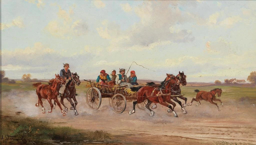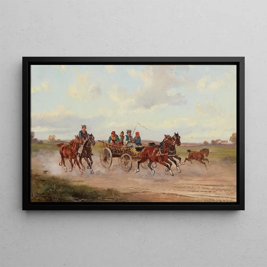 Marktwagen uit Hongarije: een levendige en kleurrijke scène uit het leven Het schilderij "Hongaarse marktwagen" van Alfred Steinacker toont een levendige scène waarin het landelijke leven bloeit onder een heldere hemel. De felle kleuren, variërend van stralend rood tot weelderig groen, creëren een vrolijke en dynamische sfeer. De techniek van Steinacker, gekenmerkt door expressieve penseelstreken, brengt de personages en objecten tot leven en maakt de bedrijvigheid op de markt bijna voelbaar. Elk detail, van de wagen vol verse producten tot de glimlachende gezichten van de verkopers, nodigt de kijker uit om zich onder te dompelen in deze authentieke weergave van de Hongaarse cultuur. Alfred Steinacker: een getuige van het landelijke leven aan het begin van de 20e eeuw Geboren in 1858, was Alfred Steinacker een Hongaarse schilder die de essentie van het dagelijks leven van zijn tijd wist vast te leggen. Geïnspireerd door de impressionistische beweging ontwikkelde hij een unieke stijl die realisme combineert met levendige kleuraccenten. Actief vooral aan het einde van de 19e en het begin van de 20e eeuw, wist hij de tradities en landschappen van Hongarije te vereeuwigen in zijn werken. Zijn werk wordt vaak beschouwd als een waardevol getuigenis van de cultuur en levenswijzen van zijn land, waardoor hij een belangrijke figuur is in de Hongaarse kunst. Een decoratief stuk met vele voordelen De kunstdruk van "Hongaarse marktwagen" is een ideale keuze om uw interieur te verfraaien, of het nu in een woonkamer, kantoor of slaapkamer is. De afdrukkwaliteit garandeert een goede weergave van de kleuren en details van het originele schilderij, en brengt een vleugje authenticiteit in uw decoratie. Met zijn onmiskenbare esthetische aantrekkingskracht trekt dit doek de aandacht en wekt het nieuwsgierigheid op, terwijl het een warme en gastvrije sfeer oproept. Gun uzelf dit kunstwerk om uw leefruimte te verrijken met een vleugje geschiedenis en cultuur.