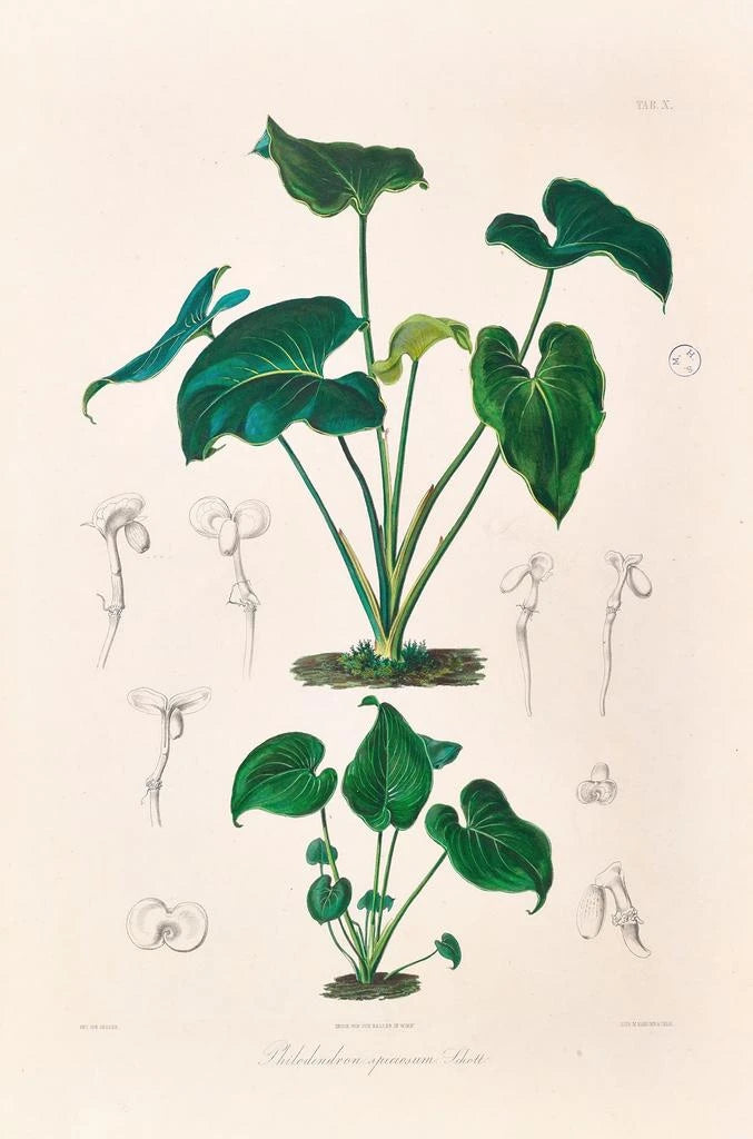 Heinrich Wilhelm Schott, botanist en illustrator uit de 19e eeuw, wordt erkend voor zijn belangrijke bijdragen aan de documentatie van tropische planten. Zijn werk maakt deel uit van de beweging van botanische kunstdruk, die wetenschap en kunst wil combineren. Geïnspireerd door de botanische ontdekkingen van zijn tijd, wist Schott de schoonheid van de aroides met wetenschappelijke precisie vast te leggen. Zijn kunstdrukken, waaronder "Icones Aroidearum Pl10", zijn niet alleen getuigenissen van zijn artistieke talent, maar ook waardevolle referenties voor botanici. Via zijn illustraties heeft hij bijgedragen aan een beter begrip van de diversiteit van plantensoorten.