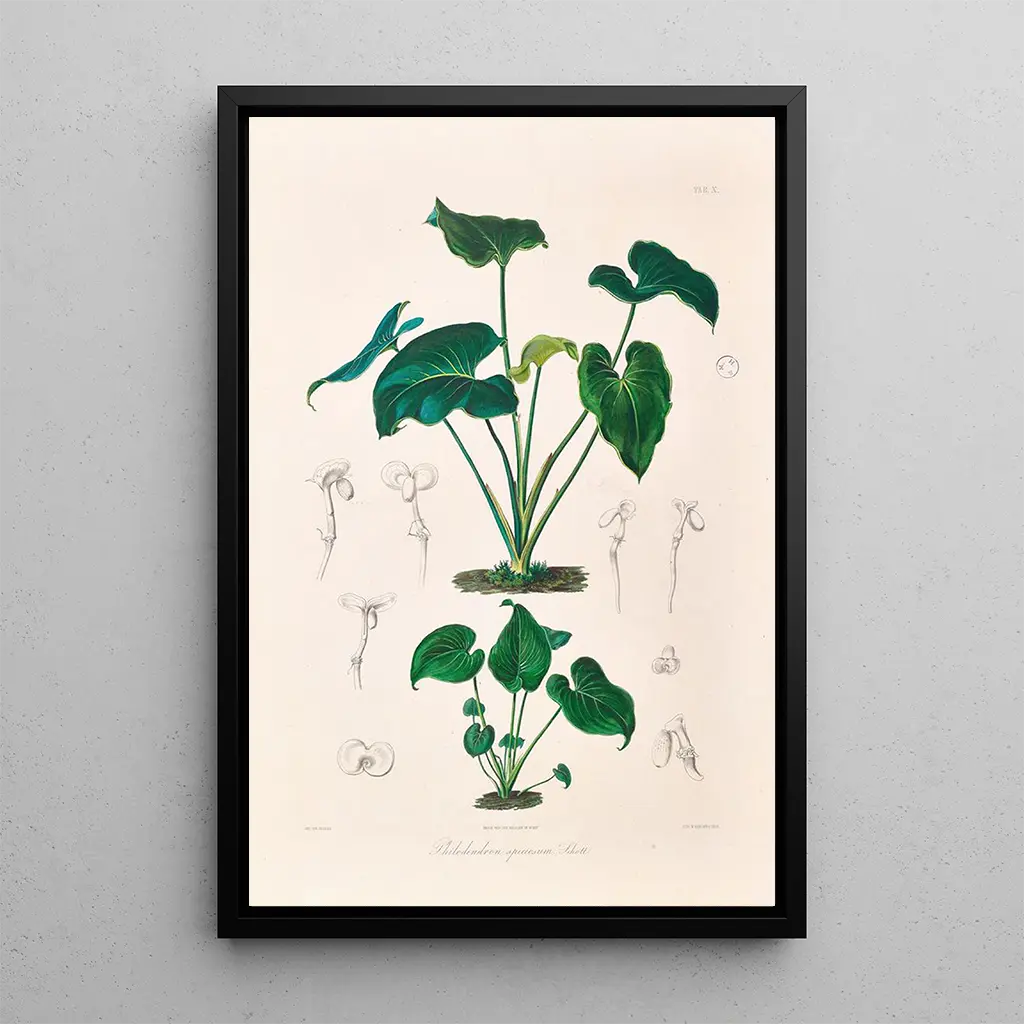L'œuvre "Icones Aroidearum Pl10" de Heinrich Wilhelm Schott est une véritable ode à la richesse des plantes aroides. Deze botanische kunstdruk, uitgevoerd met opmerkelijke precisie, benadrukt heldere tinten groen, delicate texturen en gevarieerde vormen die de blik boeien. De harmonieuze compositie en het subtiele gebruik van schaduw en licht creëren een sfeer die zowel levendig als rustgevend is, en nodigen de kijker uit om onder te dompelen in de fascinerende wereld van de aroides. Elk detail wordt zorgvuldig weergegeven, wat de expertise van de kunstenaar in het observeren van de natuur bevestigt.