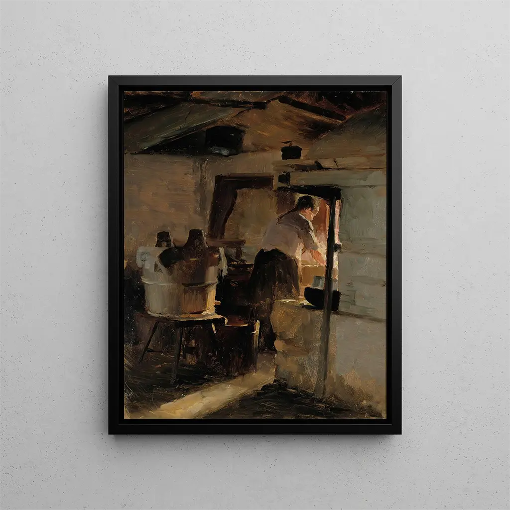 Albert Edelfelt, geboren in 1854, is een van de meest invloedrijke schilders van Finland. Opgegroeid in een artistieke omgeving, ontwikkelde hij snel interesse voor beeldende kunsten die hem naar Parijs leidde, waar hij in contact kwam met de grote meesters van die tijd. Zijn werk wordt gekenmerkt door een wens om de Finse cultuur te verkennen, terwijl hij elementen van de impressionistische beweging integreert. Edelfelt wist een brug te slaan tussen traditie en moderniteit, en beïnvloedde niet alleen zijn tijdgenoten, maar ook de toekomstige generaties Finse kunstenaars. "Aux fourneaux" is een perfect voorbeeld van deze dualiteit, waarbij een traditioneel onderwerp wordt gecombineerd met een innovatieve en expressieve techniek, wat het een inspiratiebron maakt voor Noordse kunst.