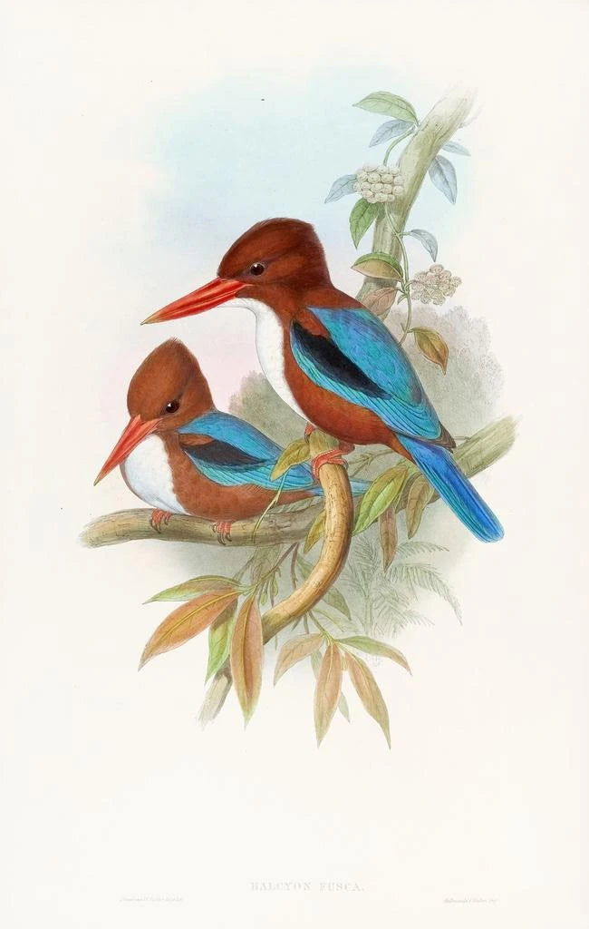 John Gould, actief in de 19e eeuw, wordt vaak beschouwd als de vader van de moderne ornithologie dankzij zijn precieze en poëtische kunstdrukken. Zijn passie voor vogels bracht hem over de hele wereld, waar hij zeldzame en exotische soorten documenteerde. Geïnspireerd door de naturalistische beweging van zijn tijd, wist Gould wetenschap en kunst te combineren, en creëerde hij werken die zowel informatief als esthetisch zijn. Zijn publicaties hadden een aanzienlijke invloed op de kennis over vogels, waardoor hij een onmisbare figuur werd in de geschiedenis van kunst en wetenschap.