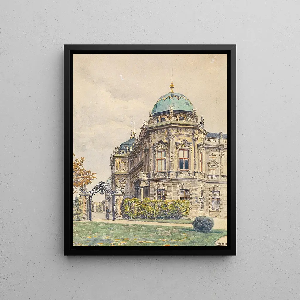De kunstdruk "Entree van de Bovenste Belvédère" van Ernst Graner roept een sfeer van grootsheid en rust op, en nodigt de kijker uit om een wereld binnen te treden waar kunst en natuur harmonieus samenkomen. Deze voorstelling, doordrenkt met verfijning, voert ons mee naar een majestueuze tuin, waar klassieke architectuur zich mengt met weelderig groen. Graner, met zijn scherpe blik, slaagt erin de essentie van deze iconische ruimte vast te leggen, en biedt een poëtische visie die verder gaat dan een gewoon landschap. Bij het bekijken van dit werk dwaalt de geest af, en voelt men een diepe wens om de wonderen te ontdekken die zich achter elke boog en elk blad verbergen.