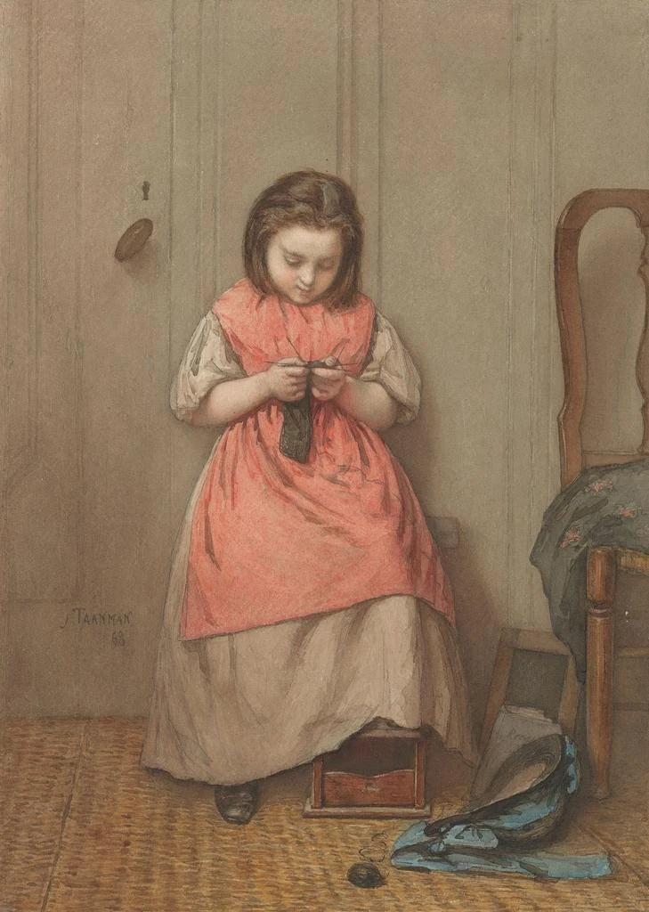 Binnen schilderij met meisje dat breit - Jacob Taanman | Kunstdruk