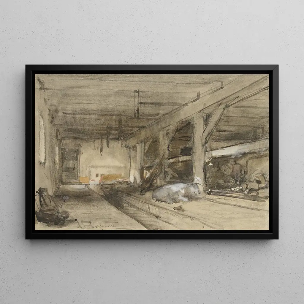 Binnenkant van een stallen: een rustige en authentieke scène uit het leven In deze kunstdruk van Binnenkant van een stallen dompelt Johannes Bosboom ons onder in een warme en intieme sfeer. De aardetinten en het spel van licht creëren een serene ambiance, waarin de details van de paarden en de ruiterspullen zorgvuldig worden benadrukt. De techniek van olieverf, met zijn delicate penseelstreken, eert de eenvoudige schoonheid van het landelijke leven. Elk element van de compositie, van zachte schaduwen tot de reflecties van objecten, draagt bij aan een gevoel van rust, en nodigt de kijker uit om zich onder te dompelen in dit moment van kalmte. Johannes Bosboom: een meester van het Nederlandse realisme Johannes Bosboom, actief in de 19e eeuw, wordt erkend om zijn talent om het dagelijks leven vast te leggen via realistische scènes. Geïnspireerd door de romantische beweging, wist hij een realistische aanpak te combineren met een poëtische gevoeligheid. Bosboom schilderde vooral interieurs, landschappen en genrestukken, waarbij hij de schoonheid van eenvoudige momenten benadrukte. Zijn werk wordt vaak geassocieerd met de Nederlandse traditie, waarin de natuur en het landelijke leven een centrale rol spelen. Via zijn schilderijen heeft hij een duurzame erfenis achtergelaten, die de harmonie tussen mens en omgeving viert. Een decoratief stuk met vele voordelen Deze kunstdruk van Binnenkant van een stallen is een ideaal decoratief stuk voor diverse ruimtes, of het nu in een woonkamer, kantoor of slaapkamer is. De kwaliteit van de afdruk en de trouw aan het originele werk maken het een aantrekkelijke keuze voor kunstliefhebbers. Het schilderij brengt warmte en authenticiteit in uw interieurdecoratie, terwijl het nieuwsgierigheid en bewondering opwekt. Met zijn rustgevende esthetiek zal deze doek uw woonruimte verrijken en een gastvrije en inspirerende sfeer creëren.