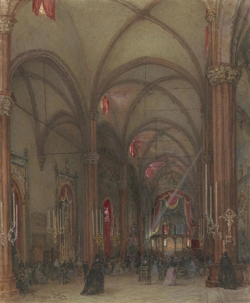 Reproductie Interieur van de kathedraal van Verona - Franz Alt – Boeiende introductie Het werk "Interieur van de kathedraal van Verona" van Franz Alt is een ware uitnodiging om onder te dompelen in de heilige en majestueuze wereld van de Italiaanse religieuze architectuur. Dit schilderij, dat het licht vastlegt dat door de gekleurde glas-in-loodramen filtert, roept een sfeer op van sereniteit en bezinning. Alt, met zijn scherpe blik en zijn scherpzinnigheid voor detail, slaagt erin de pracht van dit iconische gebouw te vertalen, terwijl hij de subtiliteiten van het licht en de schaduwen die binnen in de kathedraal dansen, onthult. Het werk beperkt zich niet tot het weergeven van een ruimte, het vertelt een verhaal, dat van een plaats vol spiritualiteit en geschiedenis, waar elke steen lijkt te fluisteren de gebeden van vervlogen eeuwen. Stijl en uniekheid van het werk De stijl van Franz Alt wordt gekenmerkt door een realistische benadering, maar ook door een impressionistische gevoeligheid die tot uiting komt in de manier waarop hij het licht weergeeft. In "Interieur van de kathedraal van Verona" gebruikt hij levendige kleuraccenten om een bijna tastbare sfeer te creëren. De architectonische details, zorgvuldig bestudeerd, worden benadrukt door lichtspelingen die de grootsheid van de locatie onthullen. De majestueuze gewelven en imposante kolommen lijken naar de hemel te reiken, terwijl de houten banken en decoratieve elementen een menselijke dimensie toevoegen aan deze ruimte. Dit werk onderscheidt zich door zijn harmonie, waarin elk element in symbiose is met het geheel, en een gevoel van evenwicht en vrede creëert. Alt slaagt er zo in niet alleen de uitstraling van de kathedraal vast te leggen, maar ook haar spirituele essentie, waardoor zijn schilderij een ware ode wordt aan de heilige schoonheid. De kunstenaar en zijn invloed Franz Alt, geboren in 1822, is een schilder die zijn tijd heeft weten te markeren door zijn vermogen om licht en architectuur in zijn werken te vertalen. Opgevoed in de artistieke context van de 19e eeuw, werd hij beïnvloed door de romantische en realistische bewegingen die in die periode opkwamen. Zijn werk past binnen een traditie van getrouwe representatie, maar brengt een unieke gevoeligheid die hem eigen is. Alt heeft gereisd door